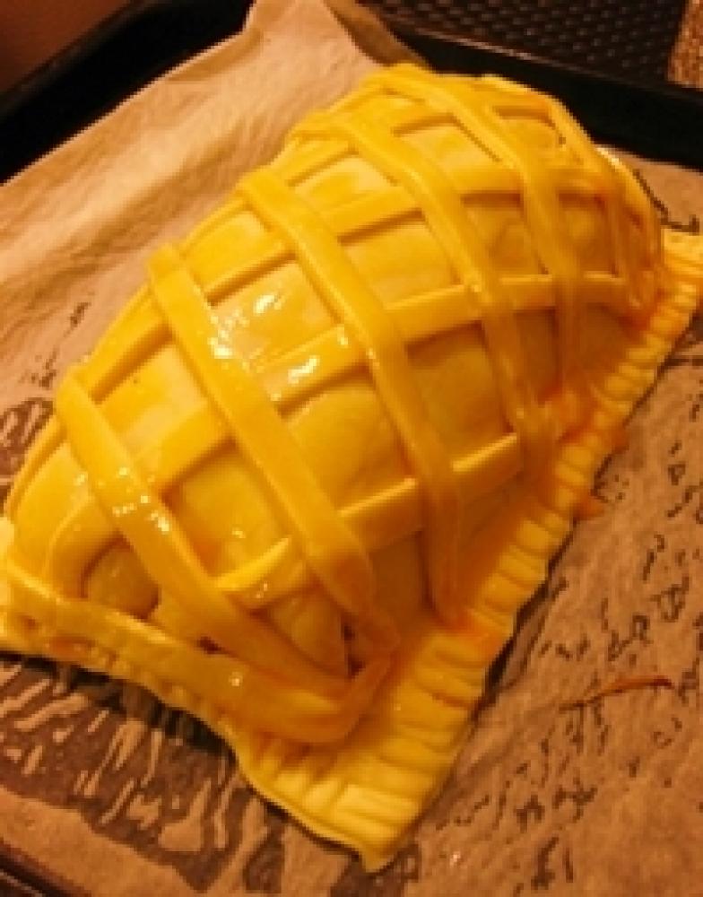 上に刷毛で卵黄を塗り、200度に予熱したオーブンで焼き色を見ながら25~30分程度焼き、出来上がり。