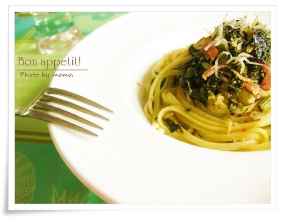香りが立ったらじゃこ、ベーコンを順に炒め、最後に野沢菜を入れてさっと炒める。