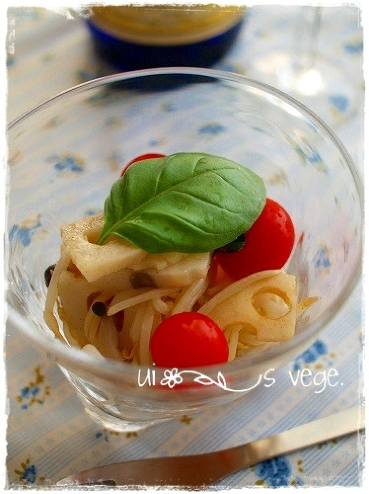 フライパンにオリーブオイルを入れて熱し、レンコンを炒める。モヤシの水を切りレンコンと一緒にナンプラーを加えサッと炒める。