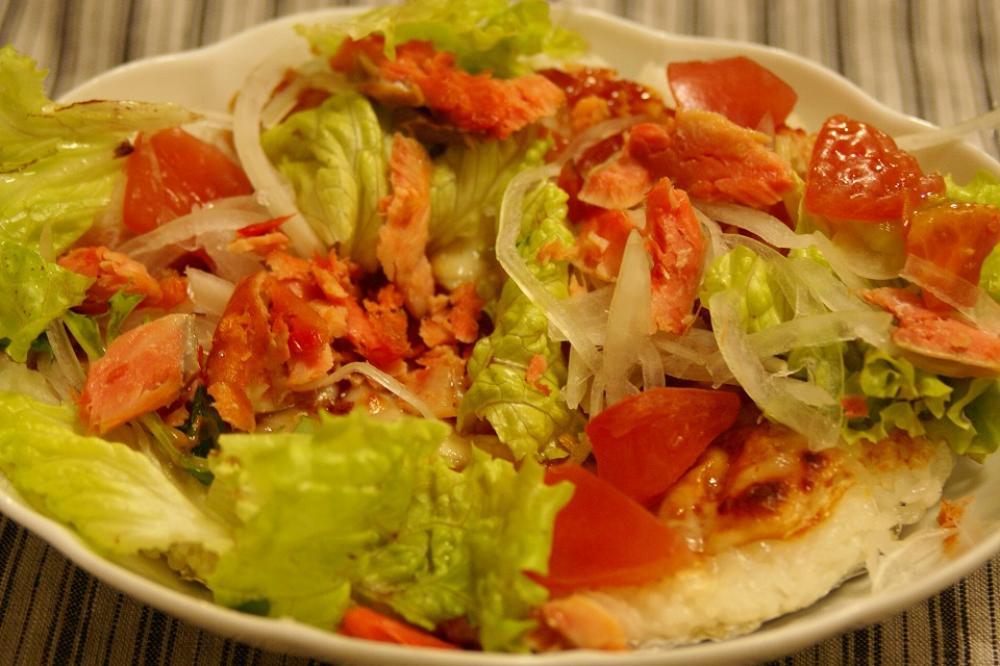 2の生地が焼けたら、その上に玉ねぎとサニーレタスと角切りにしたトマトと焼いてほぐした鮭を乗せてできあがり。