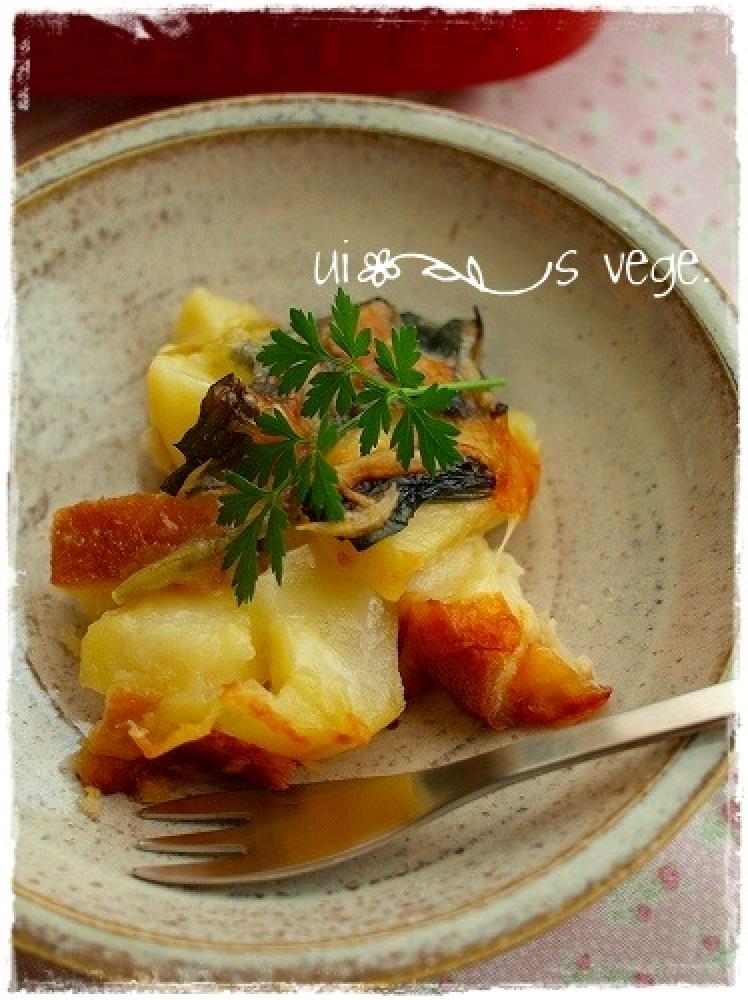 オーブンを250度に温め、グラタン皿に一口大に切ったパンを並べジャガイモ、ほうれん草を乗せAを合わせ上からかける。