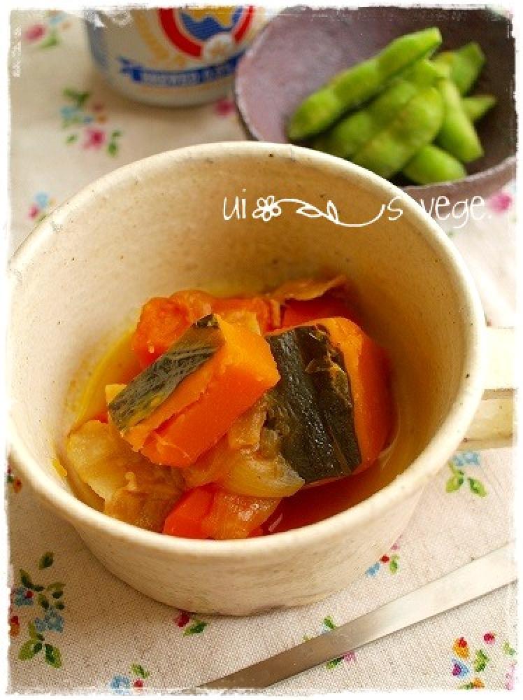 鍋を熱し玉ねぎ、豚肉、ニンジンを入れて軽く炒める。出汁とカボチャを入れ砂糖・酒・醤油を加え蓋をして15分中火で煮る。