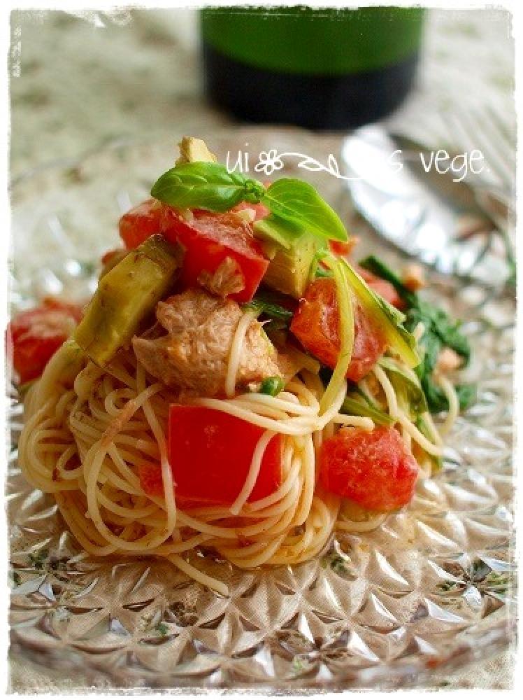 カッペリーニは茹でて水で洗い水分を切って冷やしておく。