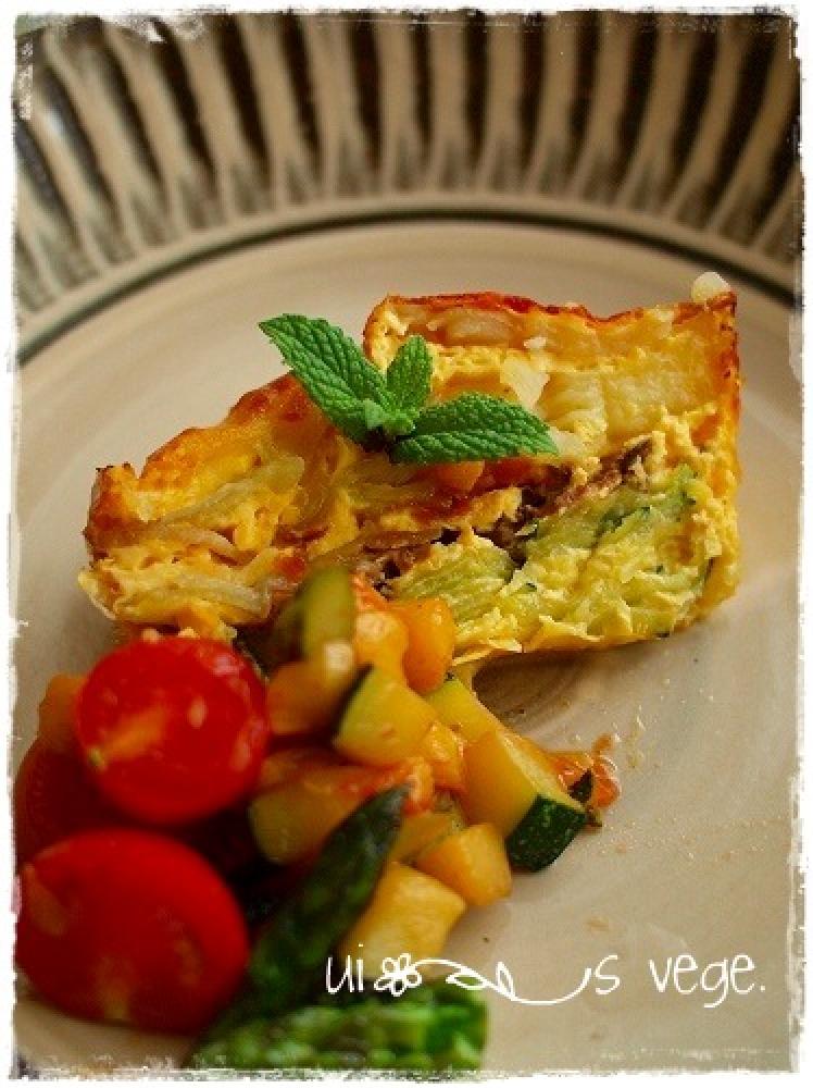 ![]() 野菜を敷いた耐熱容器に卵を流し込み、ピザ用チーズを乗せて220℃のオーブンで35分焼いて出来上がり。