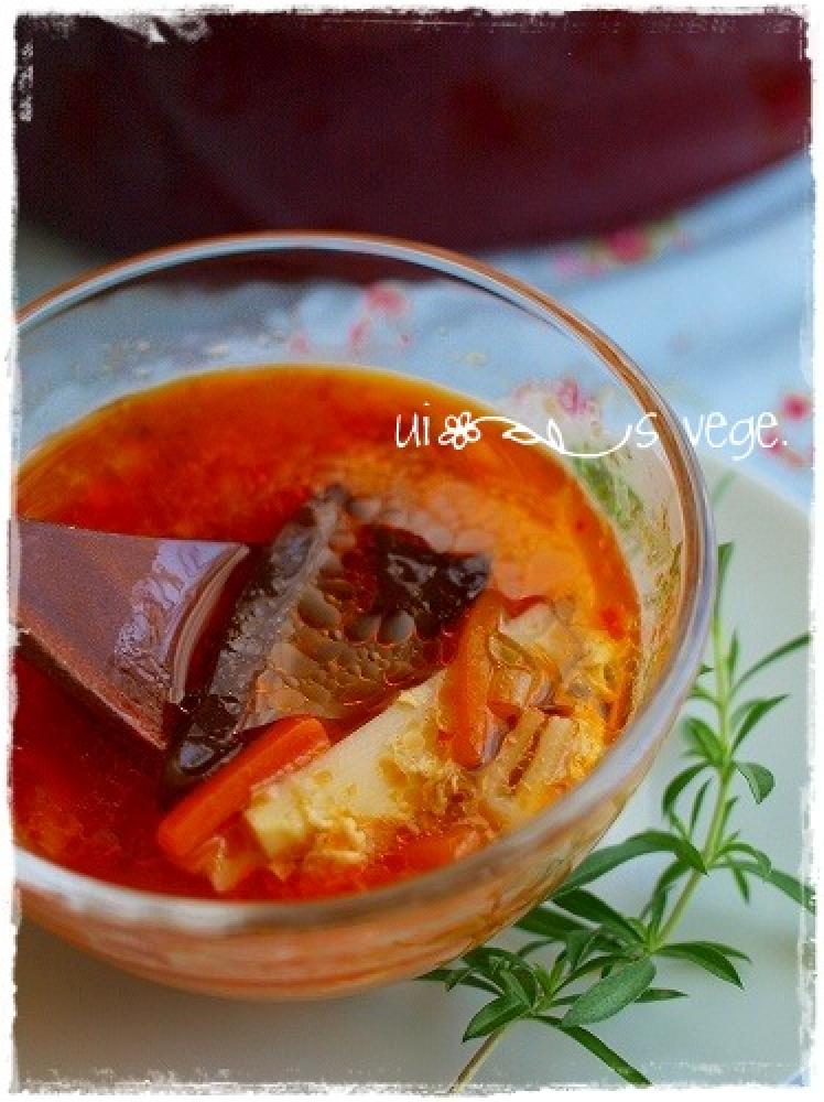 味が整ったら酢を加える。様子を見ながらお好みで調整し酸味と辛味がちょうどよくなったら、よく溶いた鶏卵を回し入れる。
