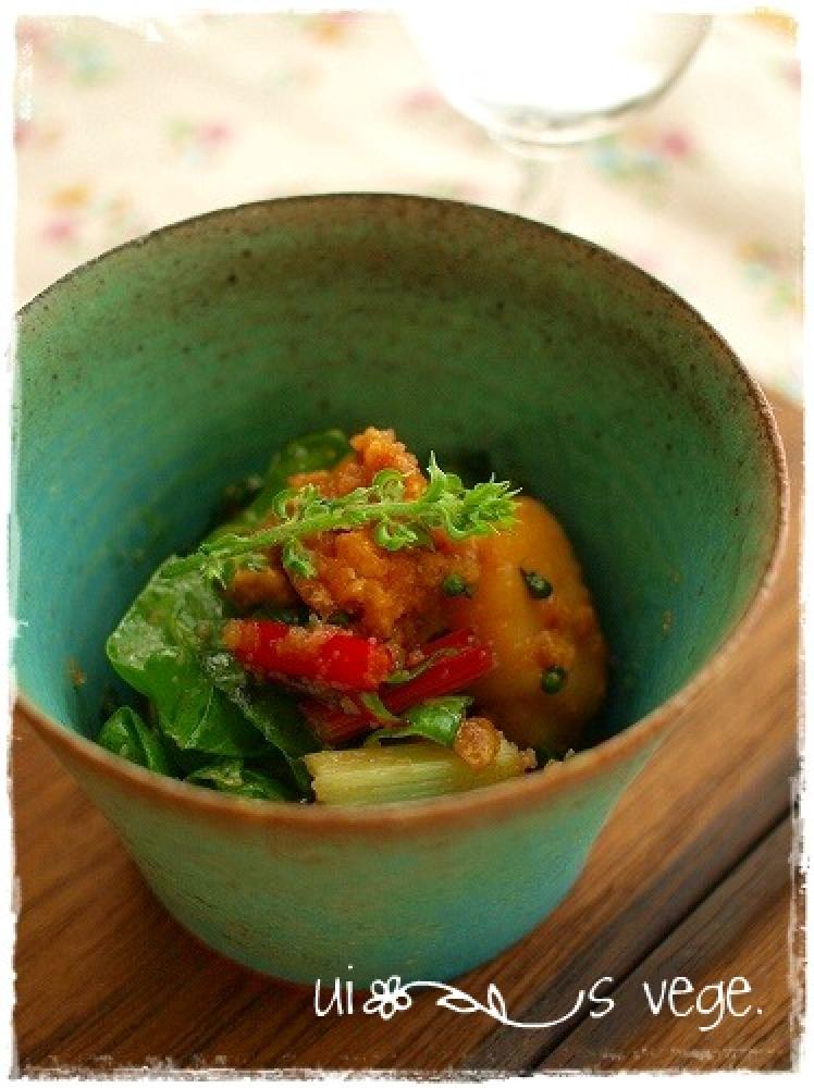 フダンソウの入ったボウルに焼いたホタテを入れ大葉・穂紫蘇を加えて混ぜる。