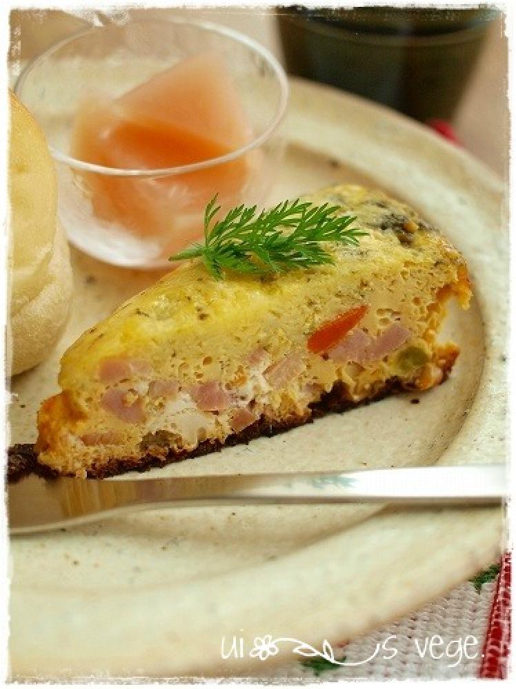 中火で焼き、周りが少し固まってきたら箸で全体を軽く混ぜ弱火にして上にチーズを散らして蓋をし蒸し焼きにする。