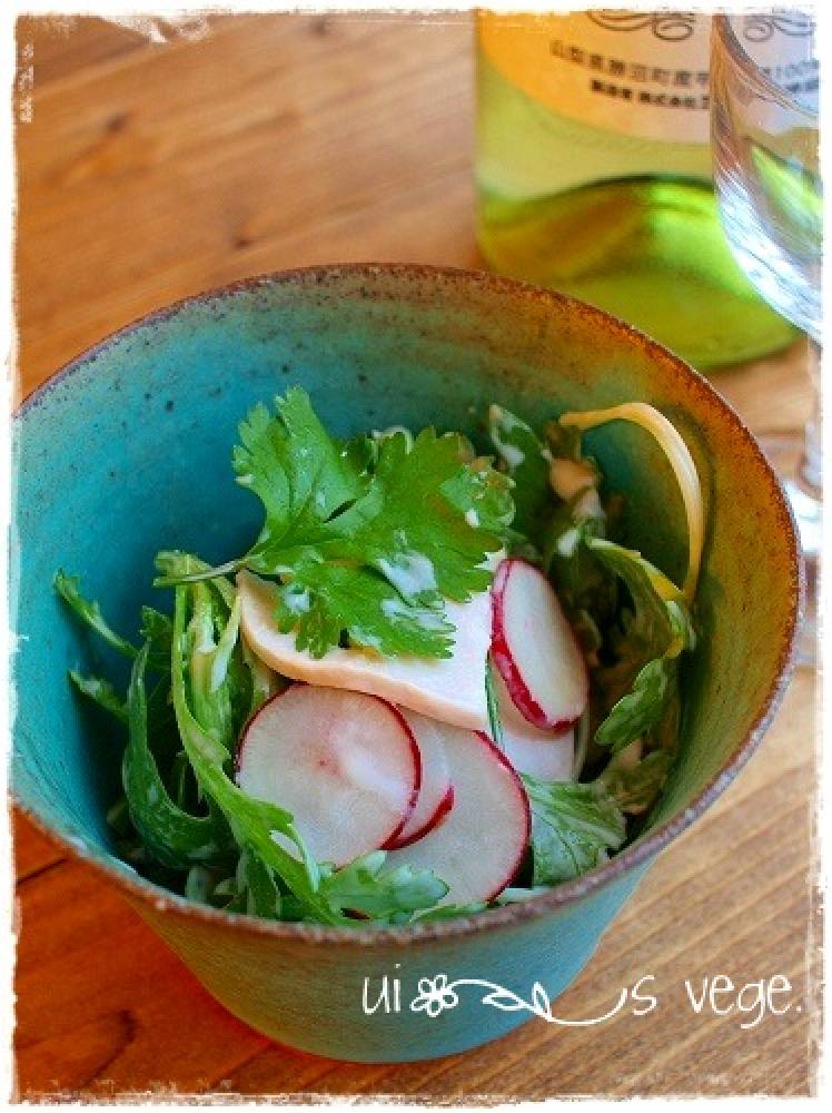 春菊・パクチー・ラディッシュは洗って適当な大きさに切る。鶏ハムは薄くスライスし食べやすい大きさに切る。