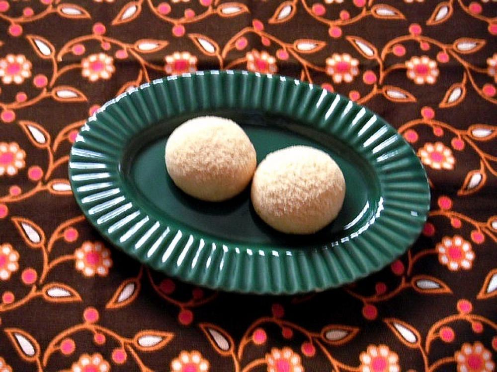 3 を10gずつ丸め、170℃のオーブンで25分焼く。焼けたら、熱いうちに 茶漉しで、トッピング用の和三盆をふる。