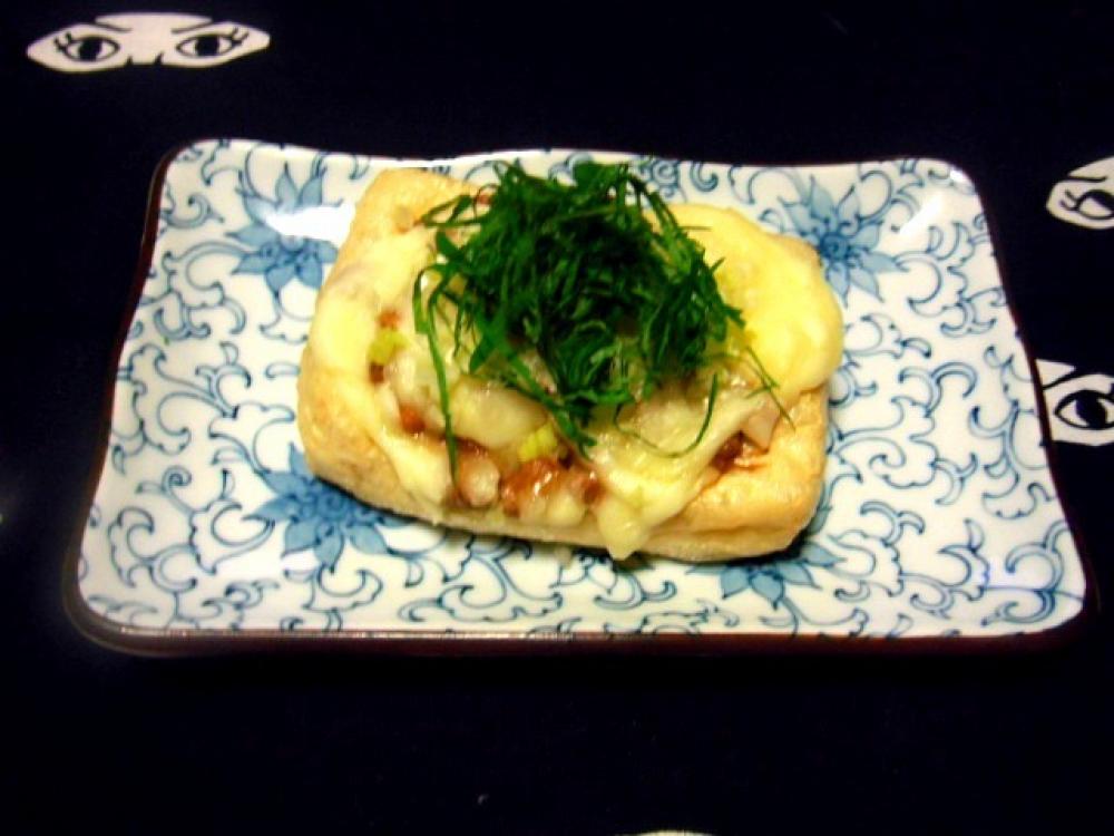 油揚げの上に、ポン酢で和えた納豆、とけるチーズをのせ、オーブントースターで、チーズがとけるまで焼く。