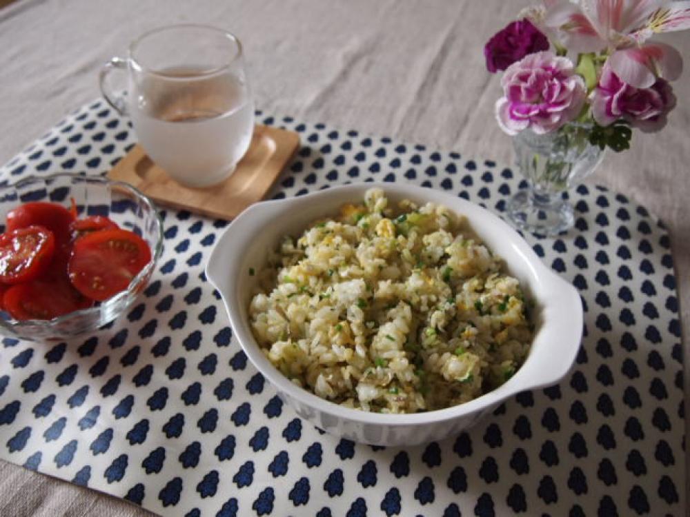 フライパンに油を入れて熱し、じゃこと野沢菜、ネギを軽く炒めご飯を入れとき卵を加えてパラパラに炒める。