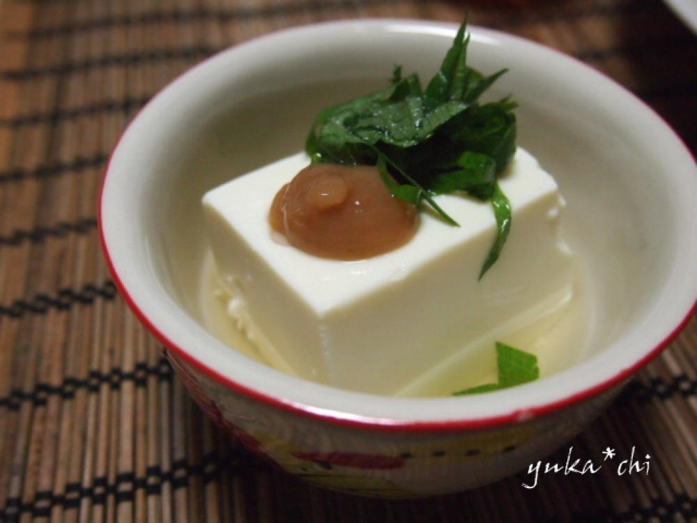 白だしを水で薄めて豆腐にかけ、冷蔵庫で冷やしてから、食べるときに梅肉と大葉をトッピング。