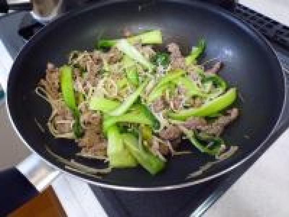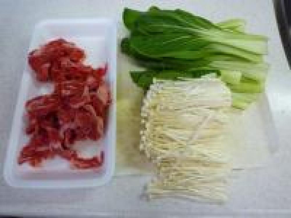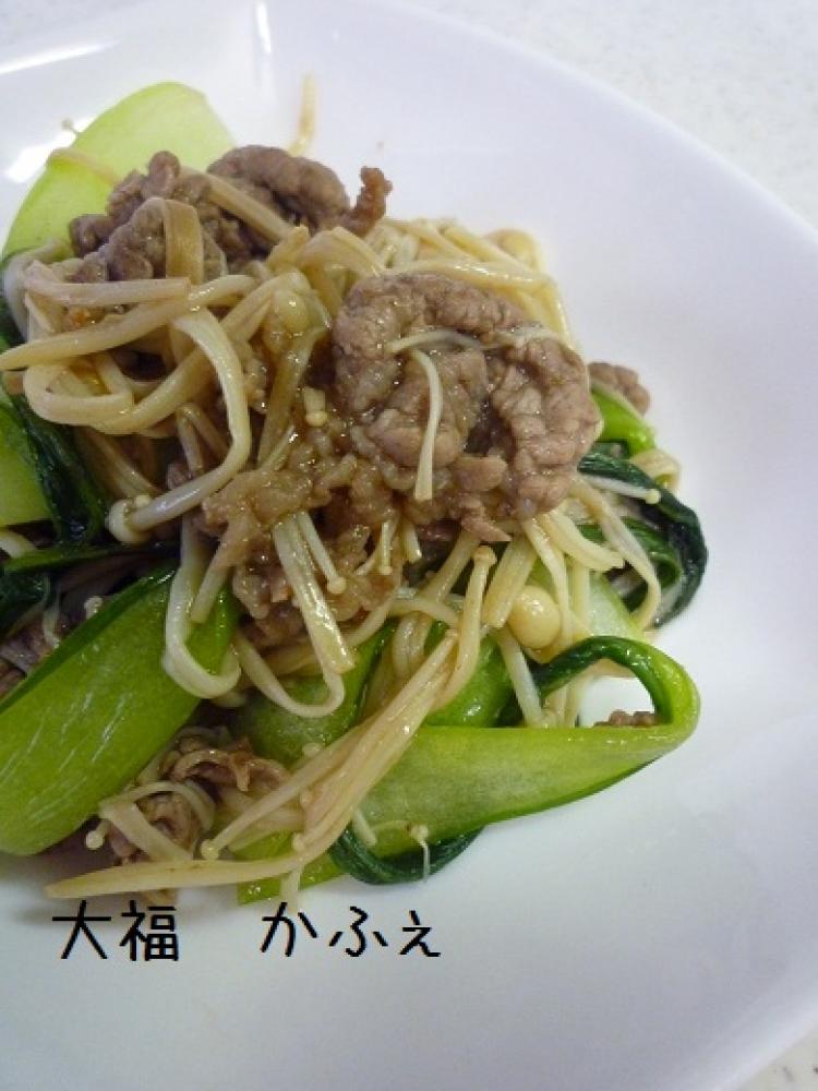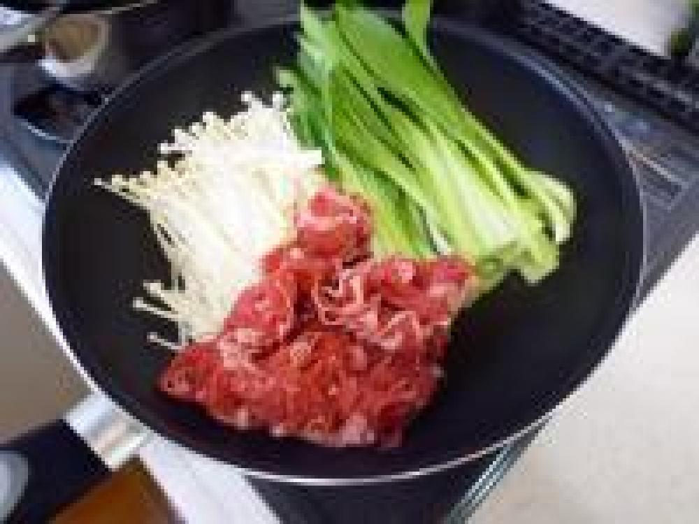 ![]() フライパンに油をひいて、牛肉、チンゲン菜、エノキを炒めます。