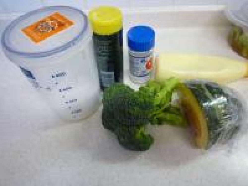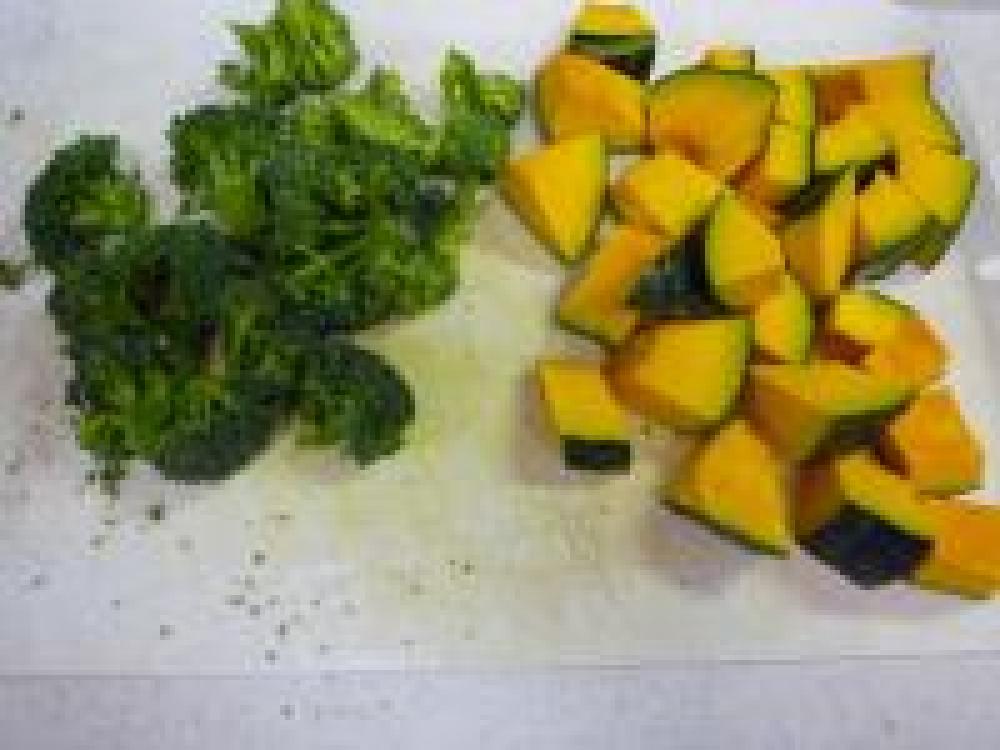 ![]() かぼちゃはわたを取り除き洗って、小さ目に切り分けます。ブロッコリーも洗って、茎の部分を切り落とし一口大に切ります。