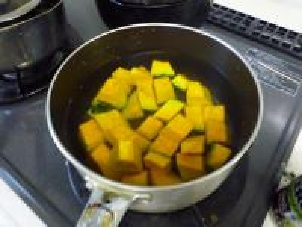 ![]() かぼちゃは柔らかくなるまで茹ででザルにあげて冷まします。