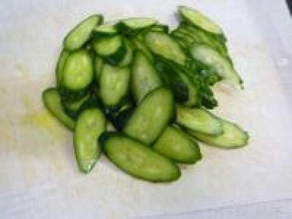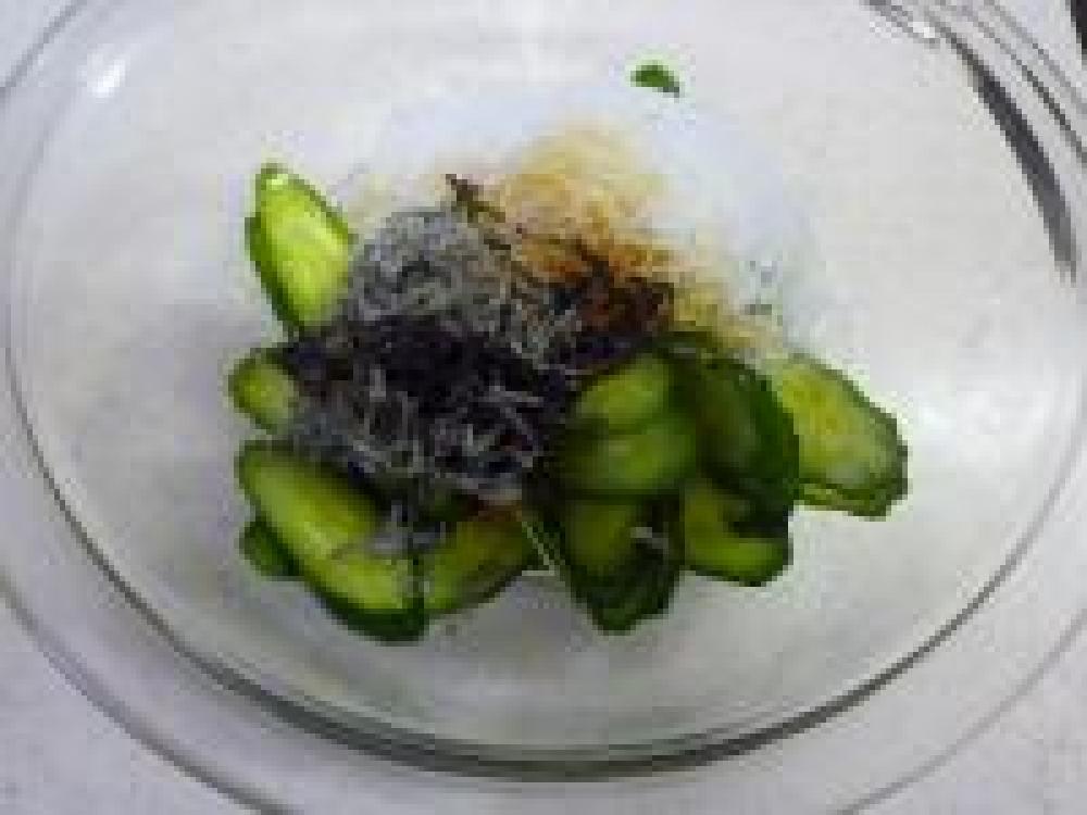 ![]() きゅうりは洗って斜め薄切りにします。