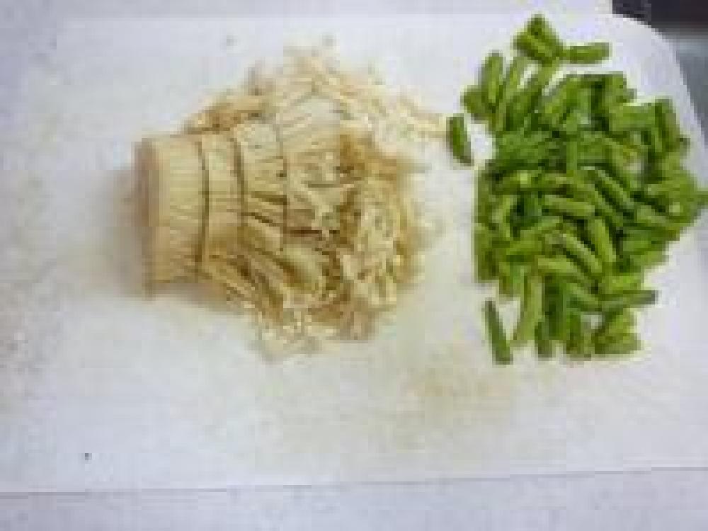 ![]() インゲンは洗って両端を切り落とし、1cmくらいに切ります。えのきは石突を切り落とし、1cmくらいに切ります。