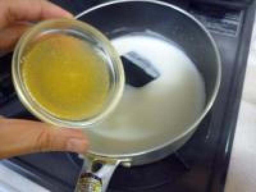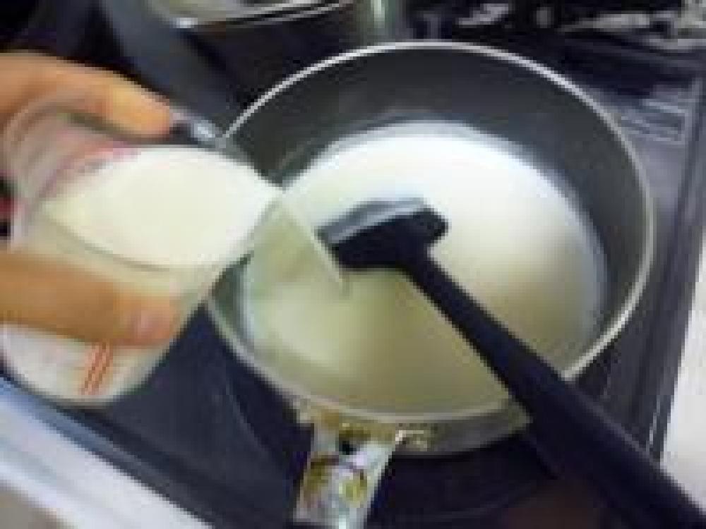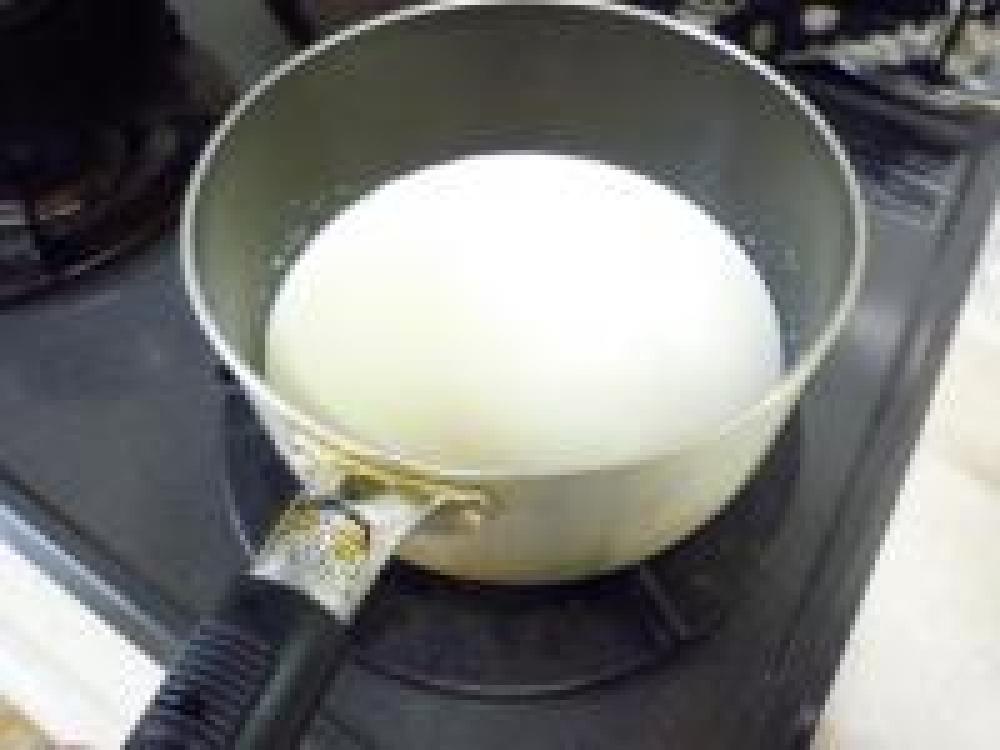 ![]() 鍋に牛乳と砂糖を入れて沸騰直前まで温めます。