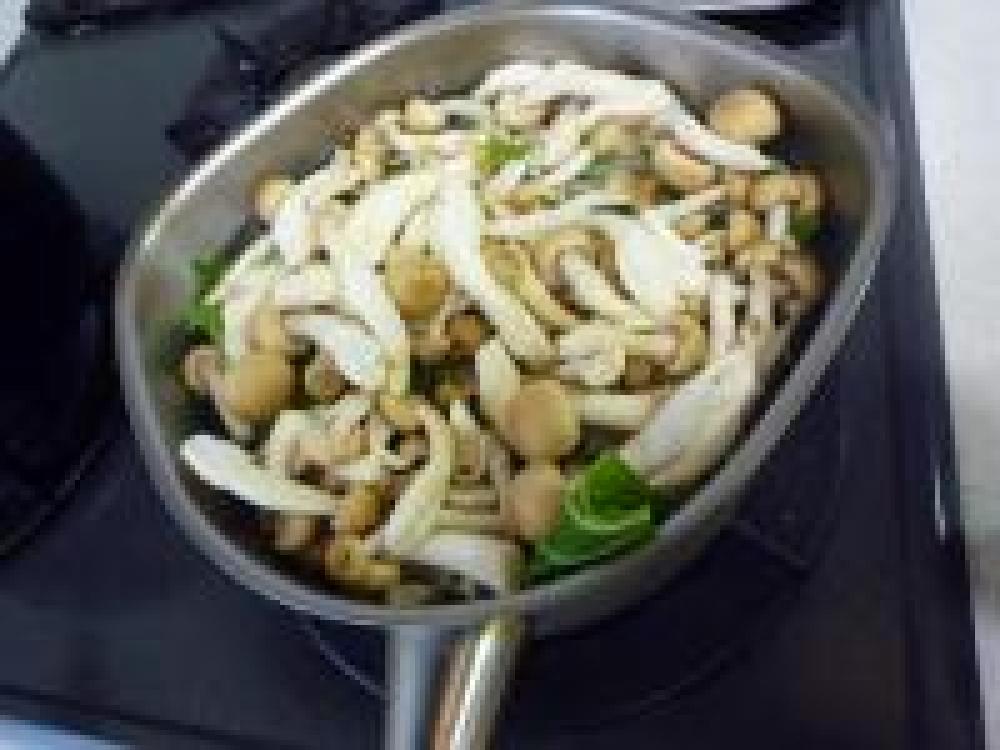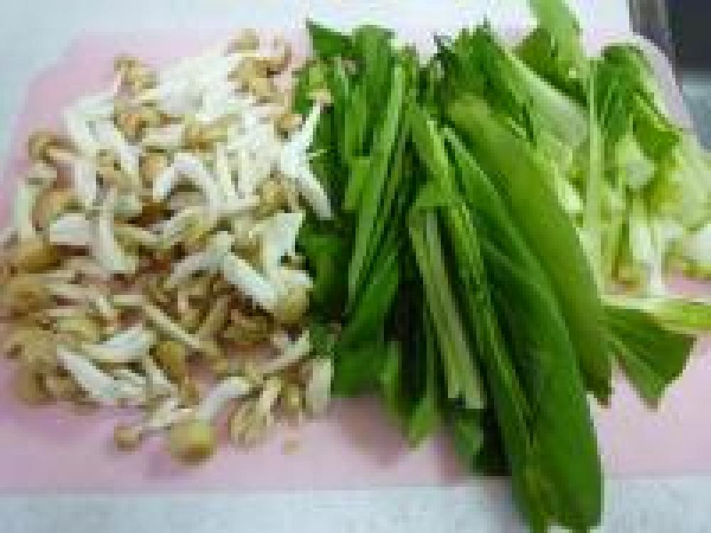 ![]() しめじは石突をとって、手でほぐし、チンゲン菜は株の根元を切り落として横に半分に切ってから、縦に洗い千切りにします。