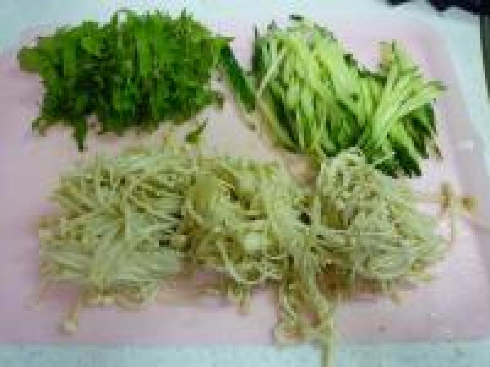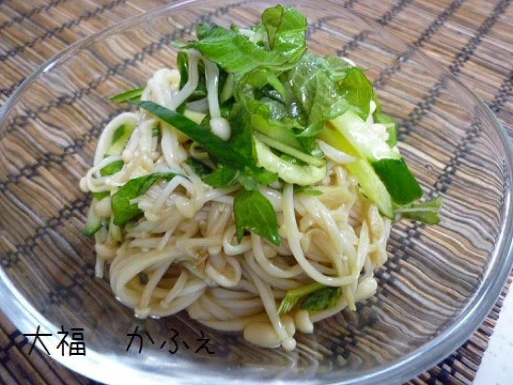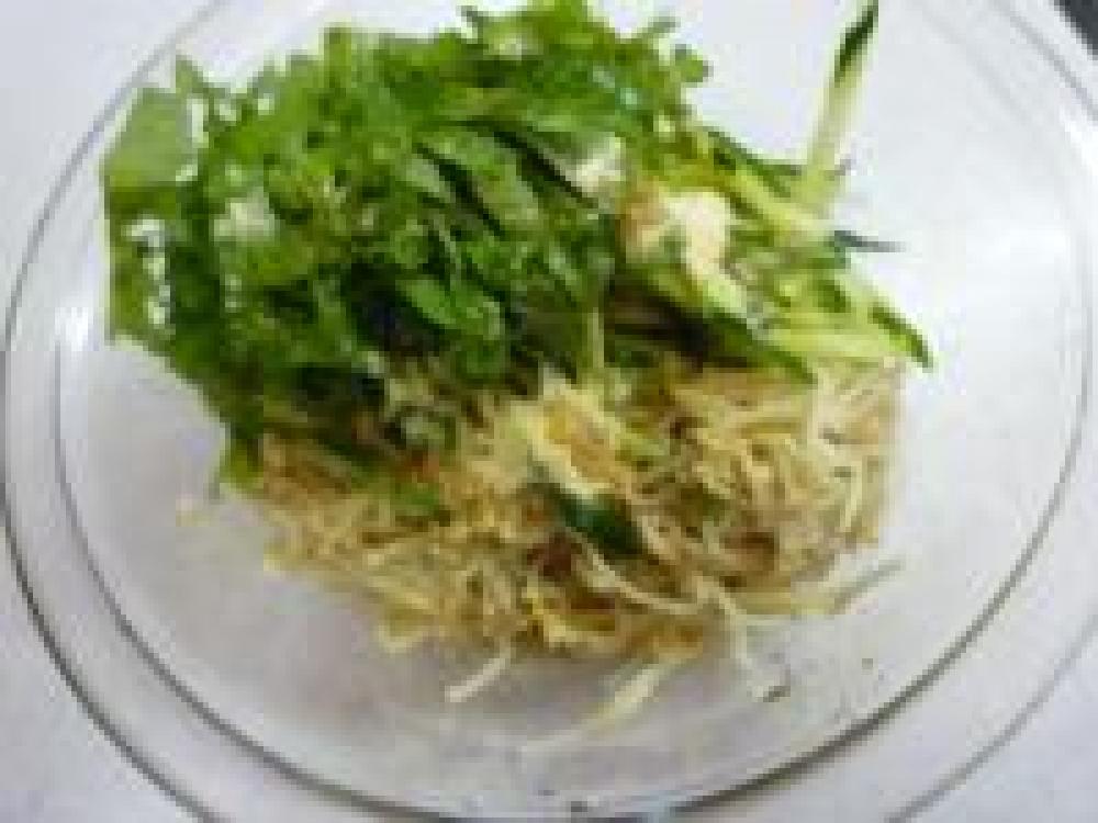 ![]() シソは洗って、粗い千切りに。きゅうりも洗って、斜め切りにしてから千切りにします。えのきは絞りながら、水からあげます。