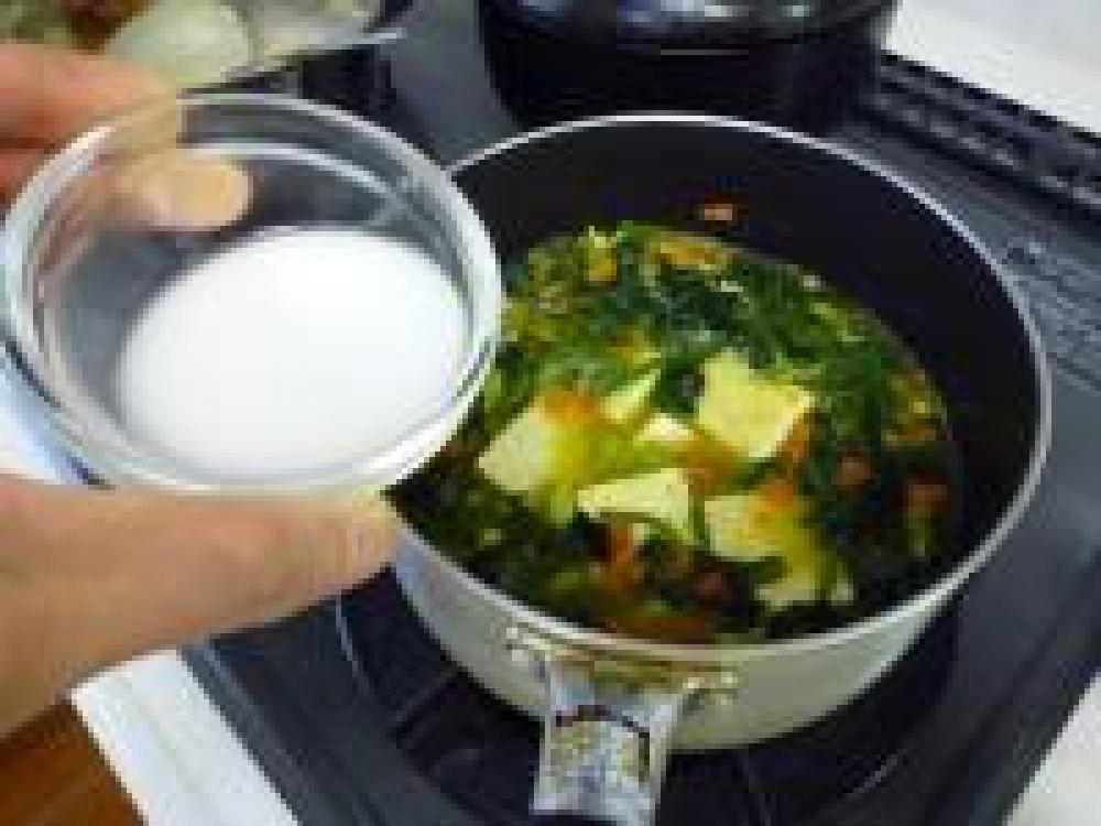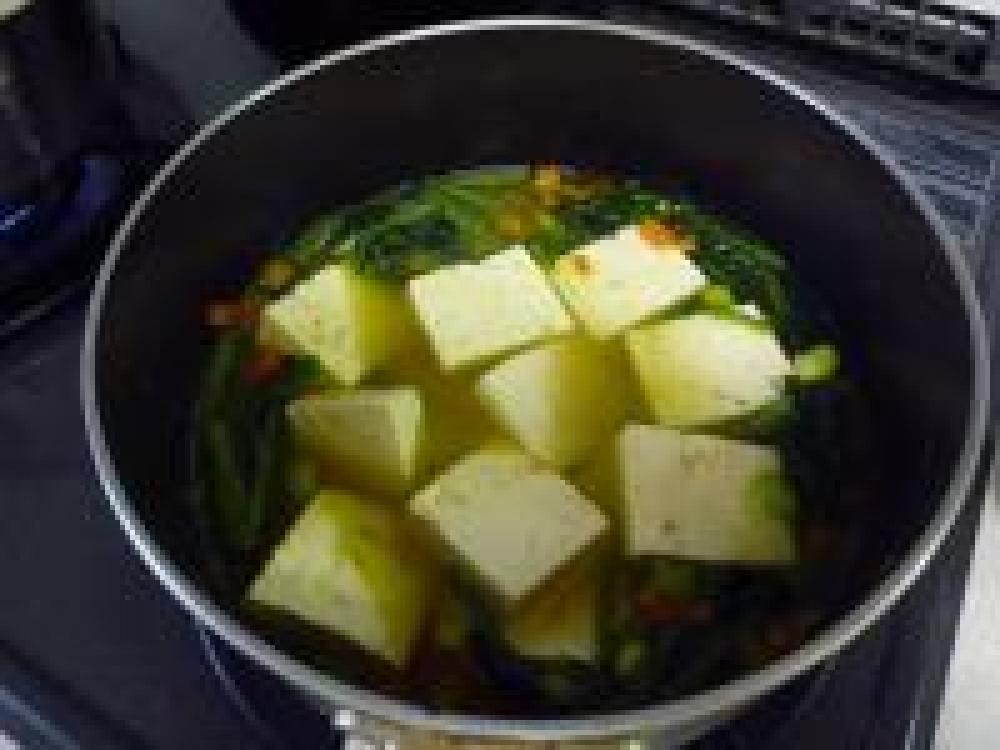 ![]() しんなりして、火がとおったら、水400ccをいれて沸騰したら、豆腐、鶏がらの素、料理酒、塩をいれて味付けをします。