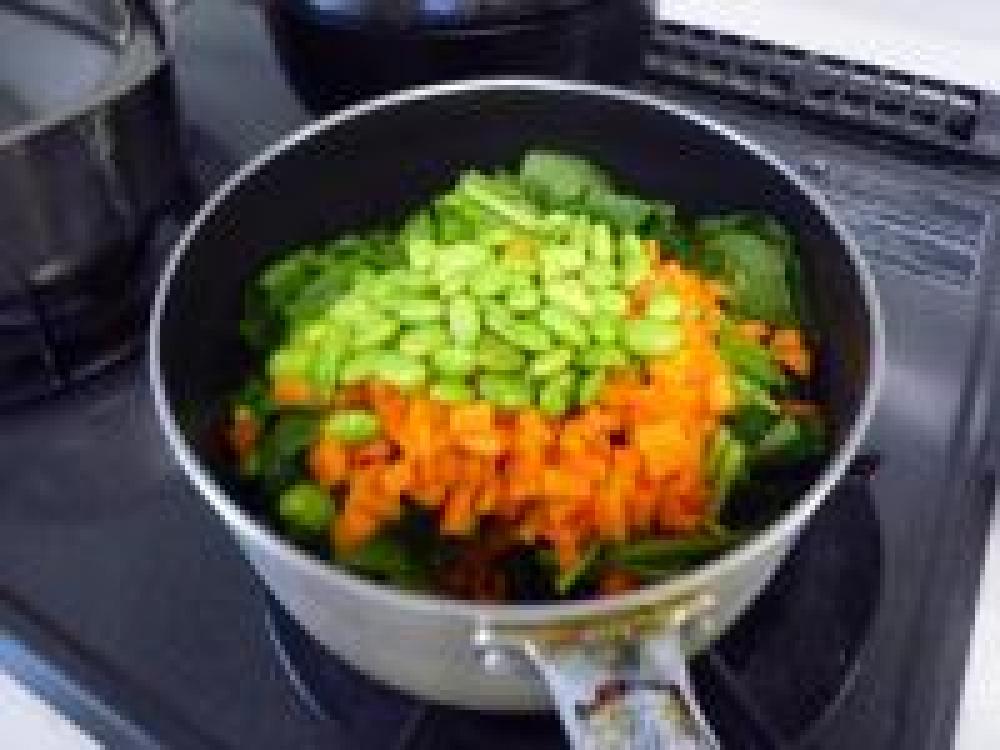 ![]() 鍋にごま油をひいてほうれん草、人参、枝豆を炒めていきます。