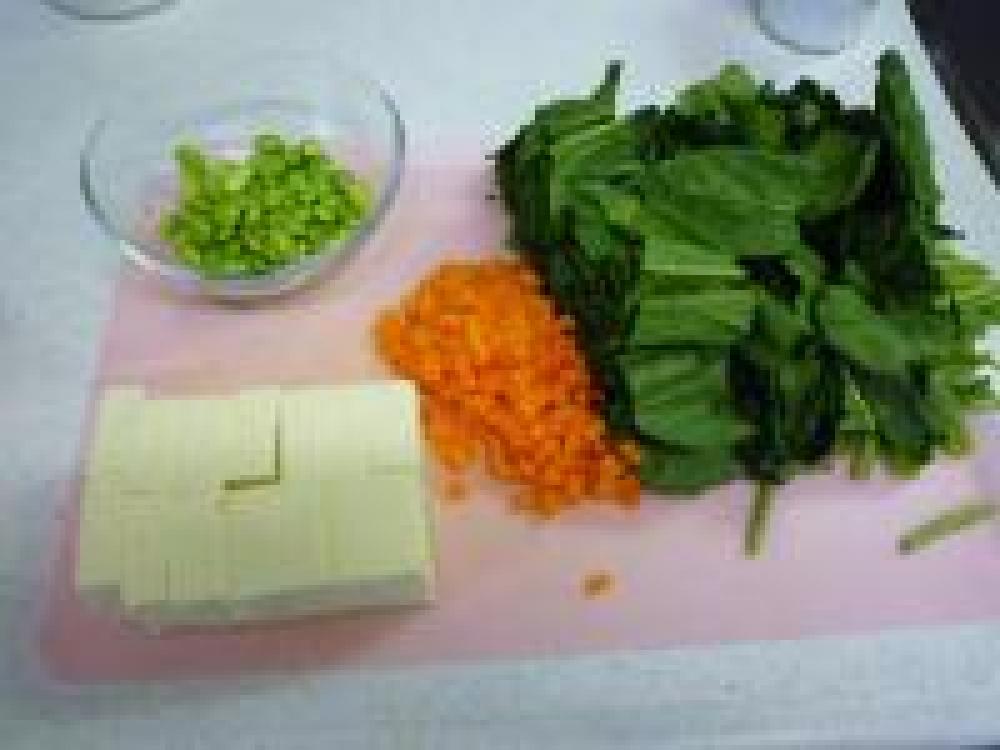 ![]() 食べやすい大きさに、ほうれん草は洗って、茎の部分を切り落としざく切りに。人参は粗みじん切り、枝豆は殻から出す。
