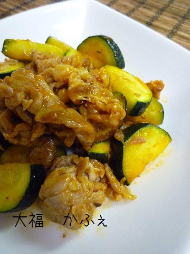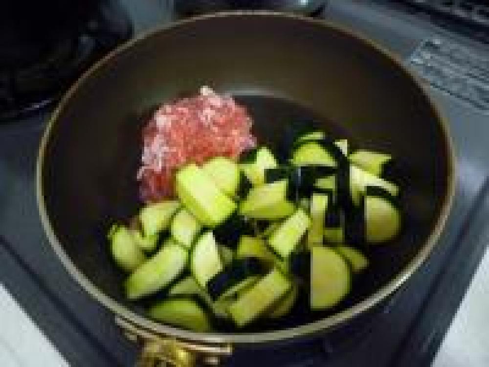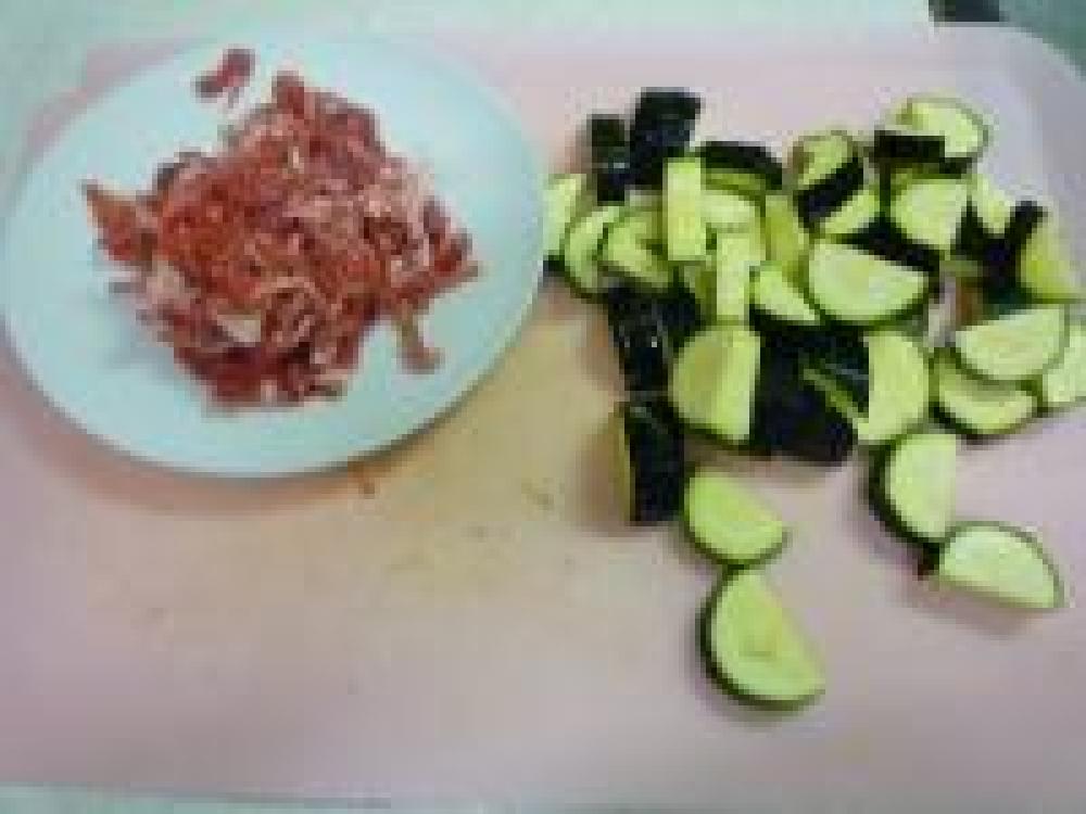 ![]() 豚肉は食べやすい大きさに、ズッキーニはヘタを切り落とし1cmくらいの三日月切りに。