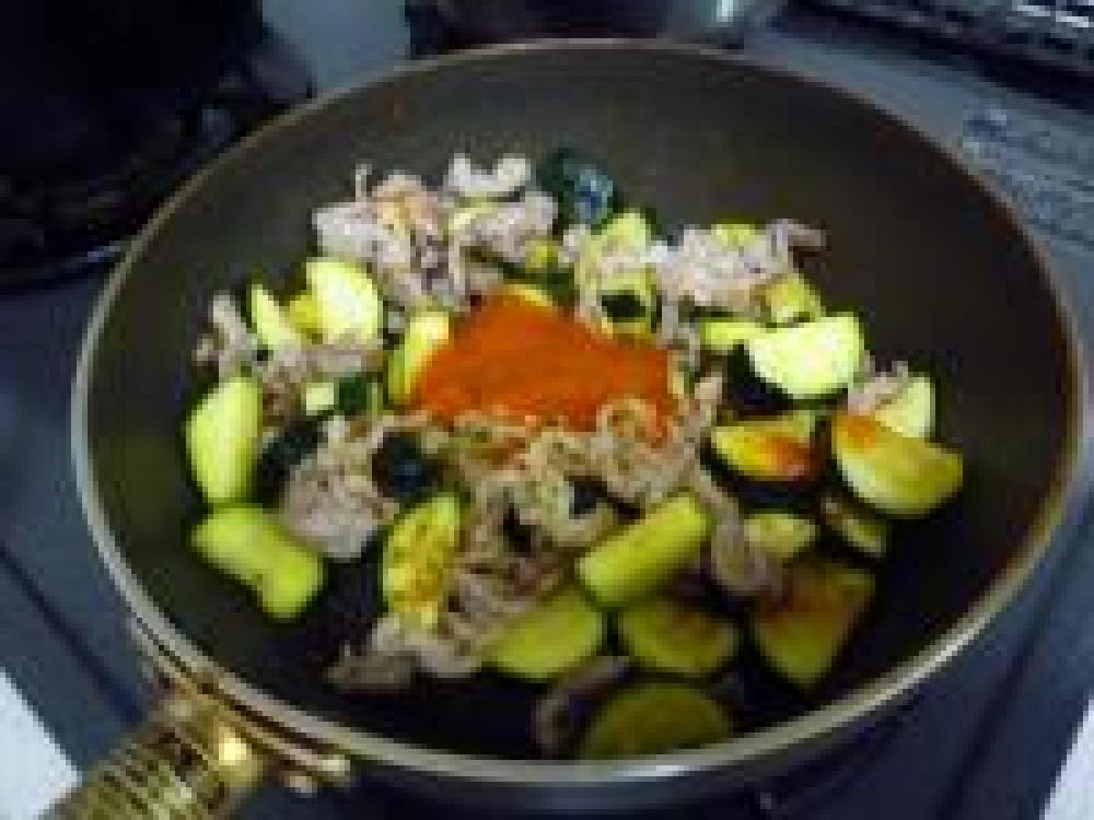 ![]() 豚肉、ズッキーニに火がとっおったらコンソメ、ピザソースで味付けして完成~