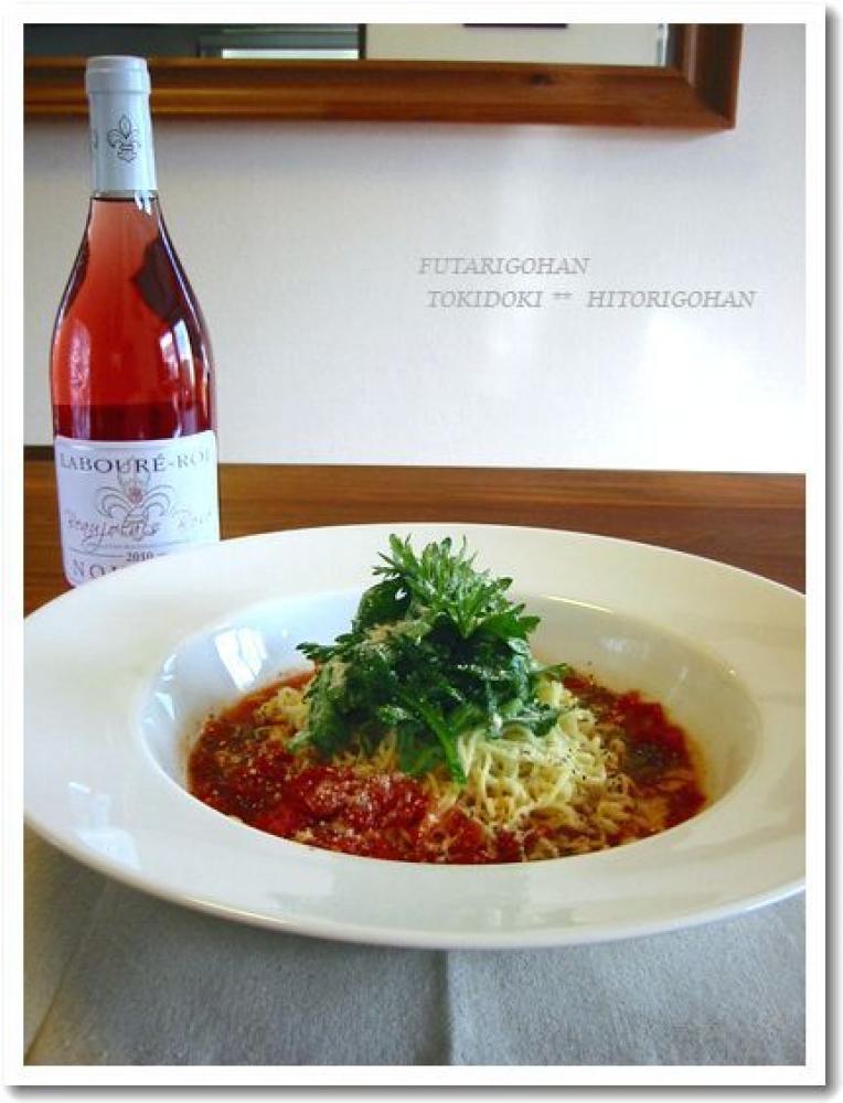 煮込んでおいたソースに塩こしょう(分量外)をして味を整え、器に麺、ソース、サラダを盛り付けて完成です。