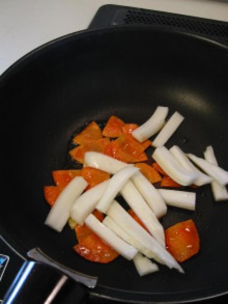 ![]() ごま油を熱してにんにく&しょうがを加えたら、固いものから順に炒めていきます。