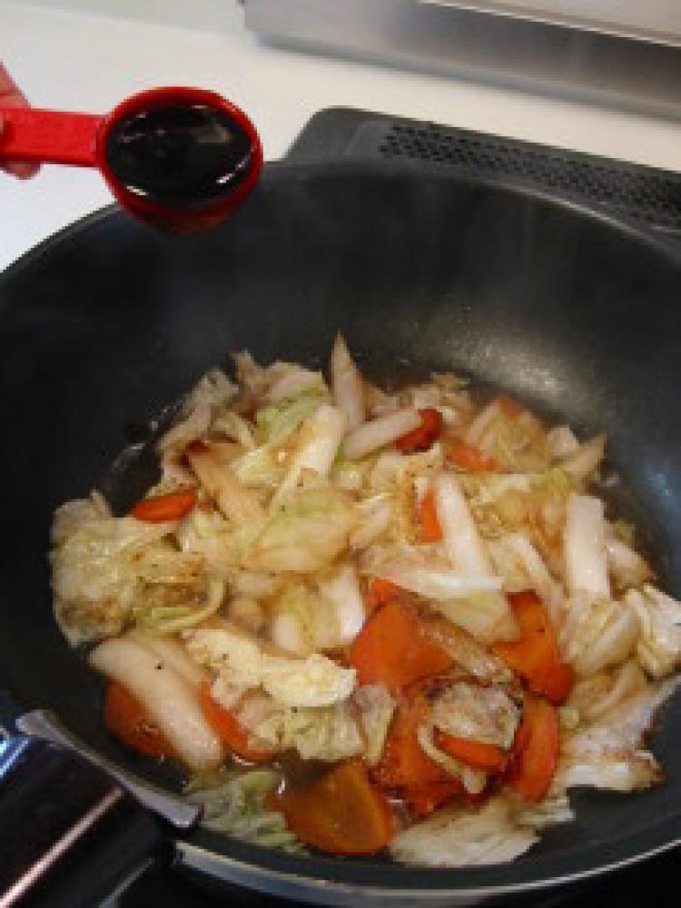![]() 軽く煮込んだらオイスターソース&しょうゆで味付けし、最後に水溶き片栗粉でとろみをつけたら完成です。