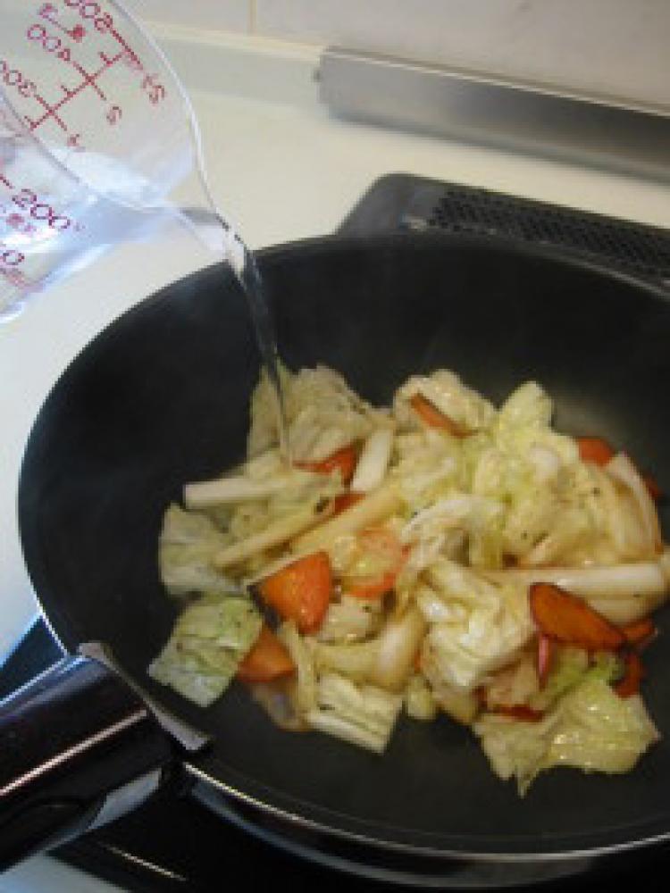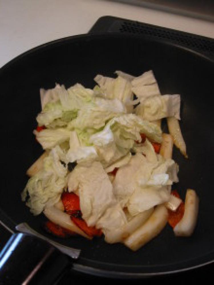 ![]() 白菜は葉と芯に分け、葉は一口大に芯は1cm幅にカットする。人参は2cm幅の薄切りにする。