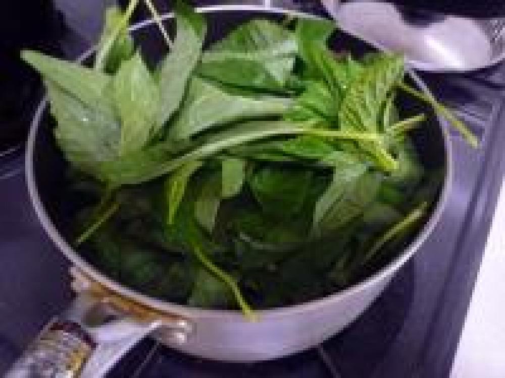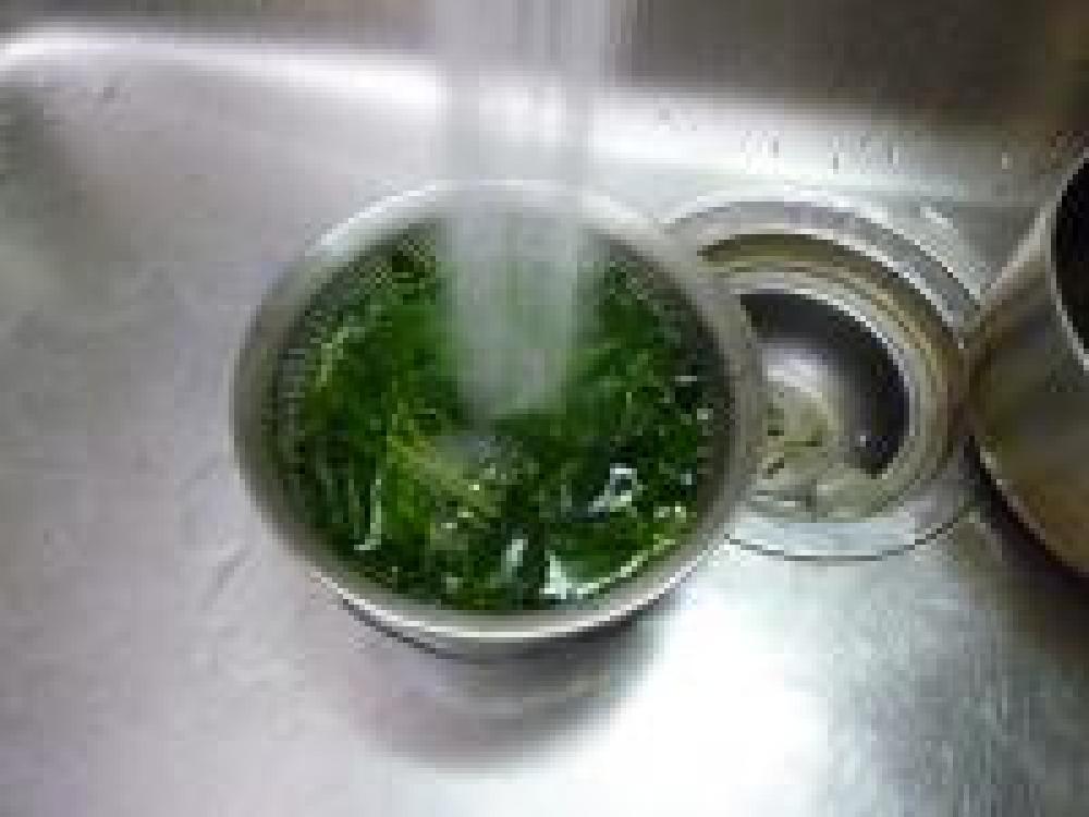 ![]() モロヘイヤは茹で上がったら、冷水にとってさっと洗い水分をしっかり絞ります。