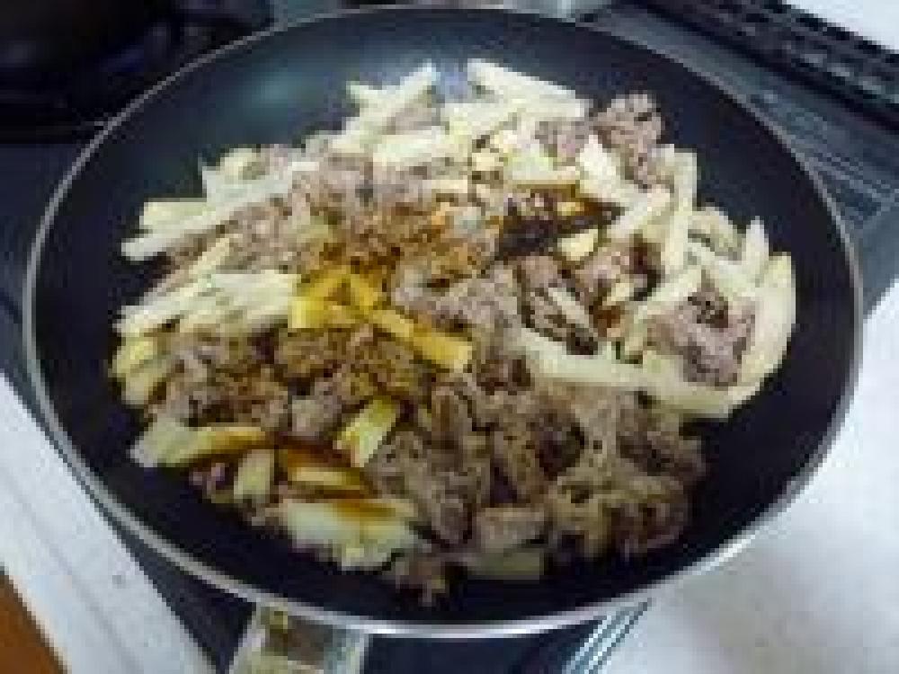 ![]() 材料に火がとおったら、合わせ調味料を加えて、絡め合わせて、よくからんだら完成です。