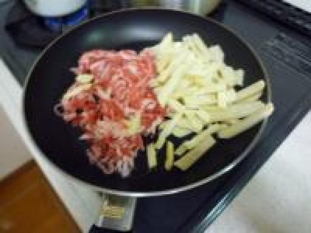 ![]() フライパンに油をひいて牛肉たけのこを