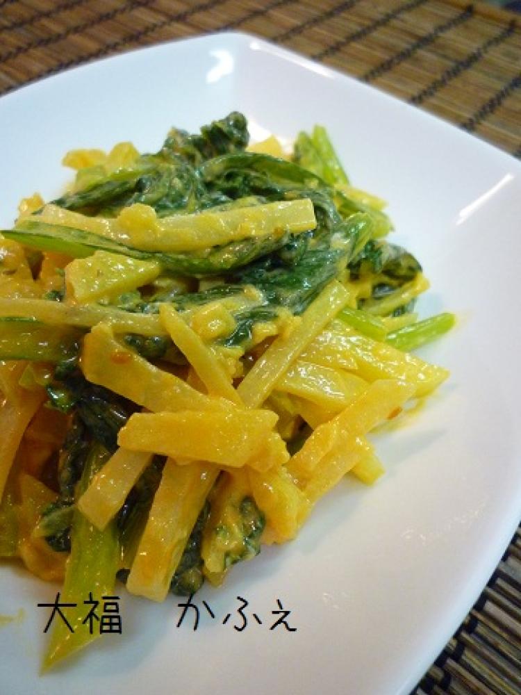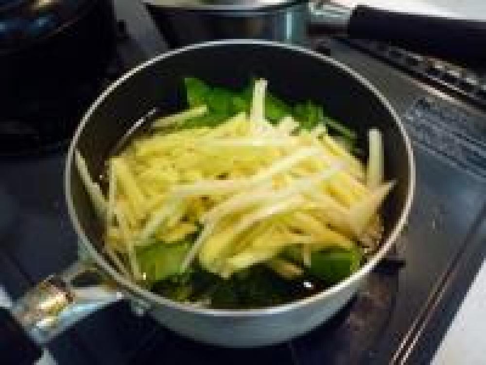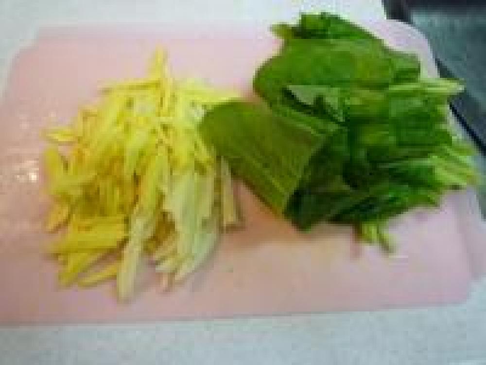 小松菜は洗って、茎を切り落として4等分位のざく切りに。 |