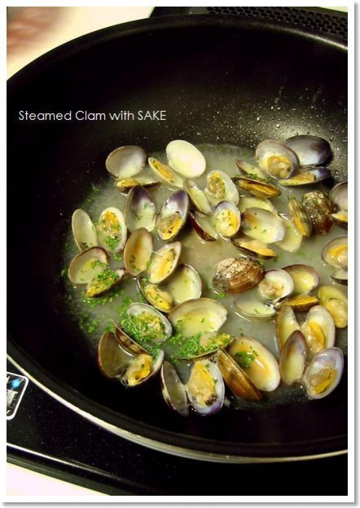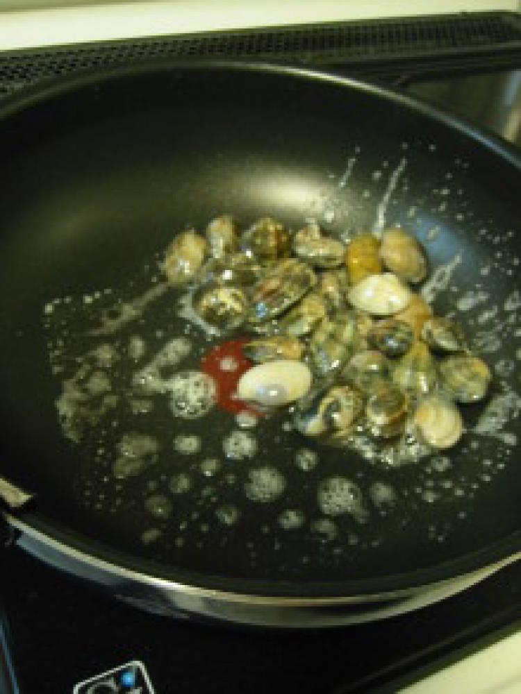 ![]() フライパンにフタをして貝の口が開くまで蒸し煮にする。