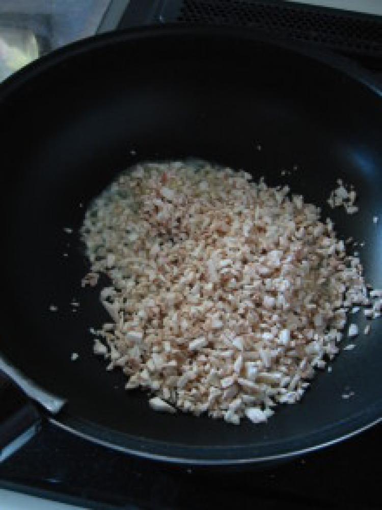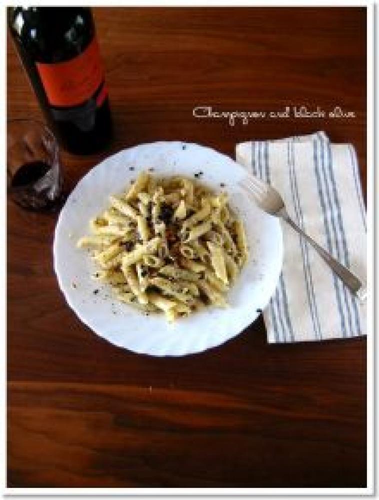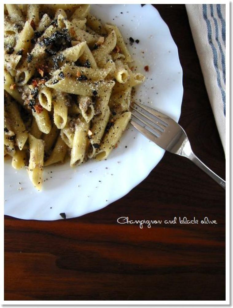 下準備:シャンピニオンとオリーブはみじん切りにする。ソースの仕上げに合わせてパスタを茹で始める。