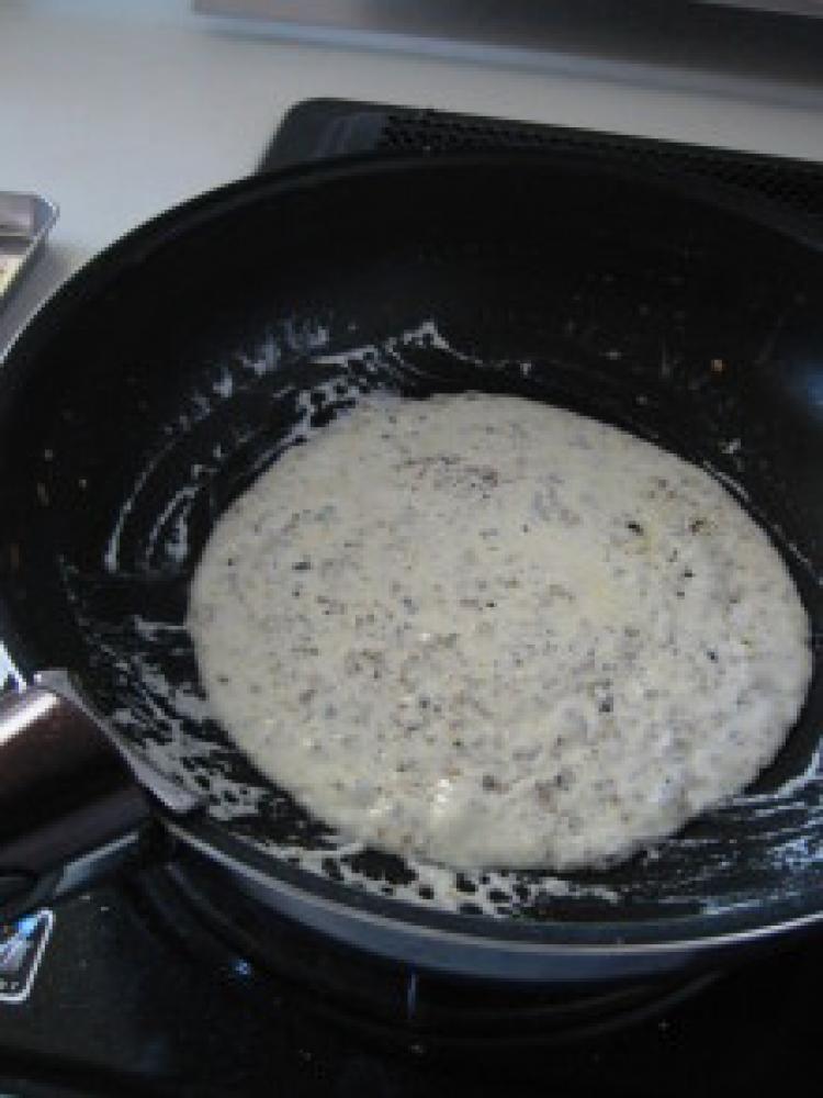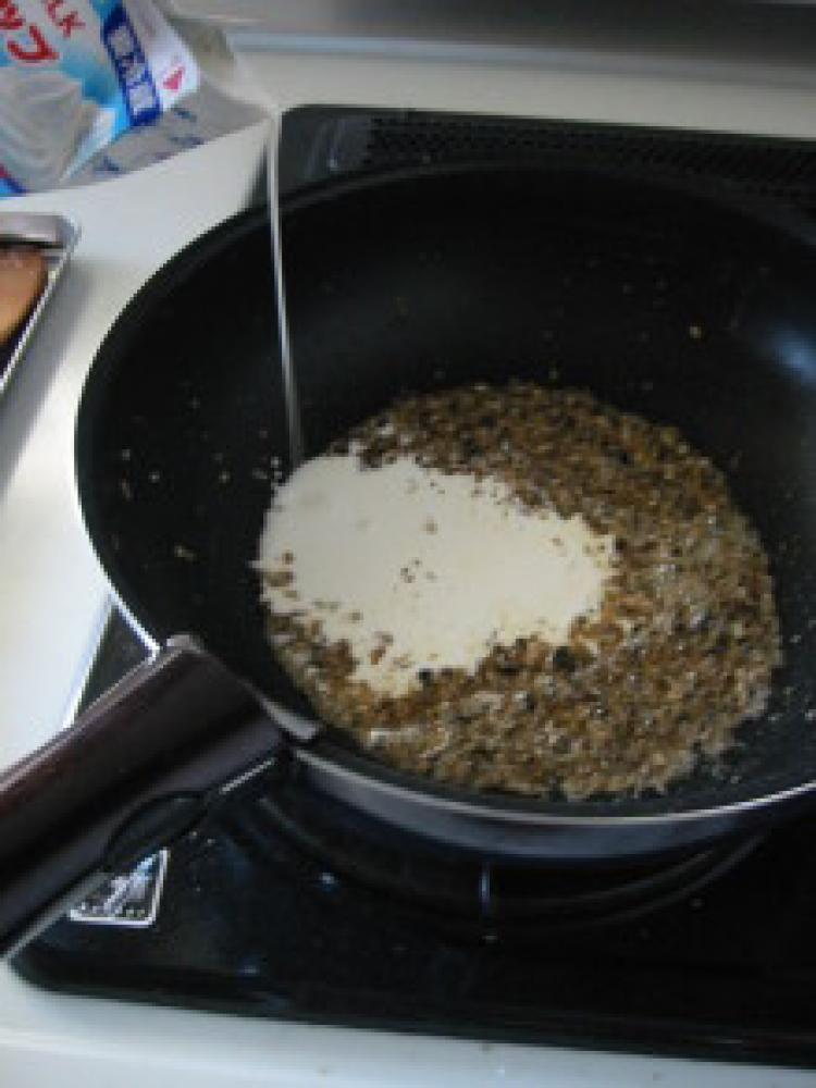 ![]() バターとシャンピニオンを火にかけ、水分を飛ばすように炒める。