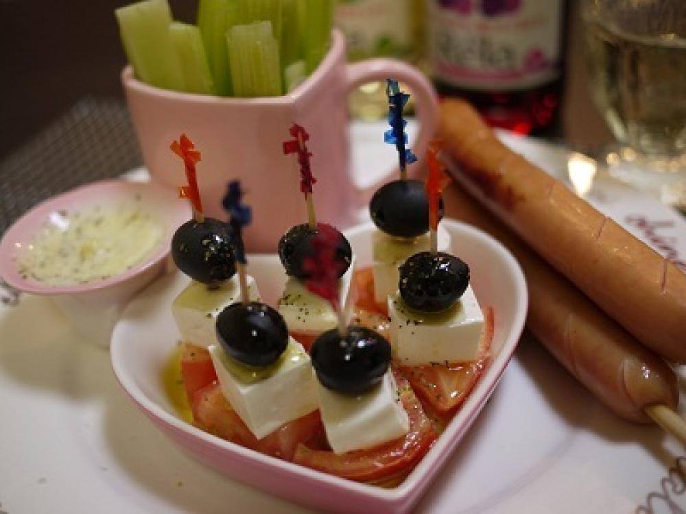 クリームチーズも2㎝角に切り、トマト・クリームチーズ・黒オリーブをのせ楊枝でとめる。