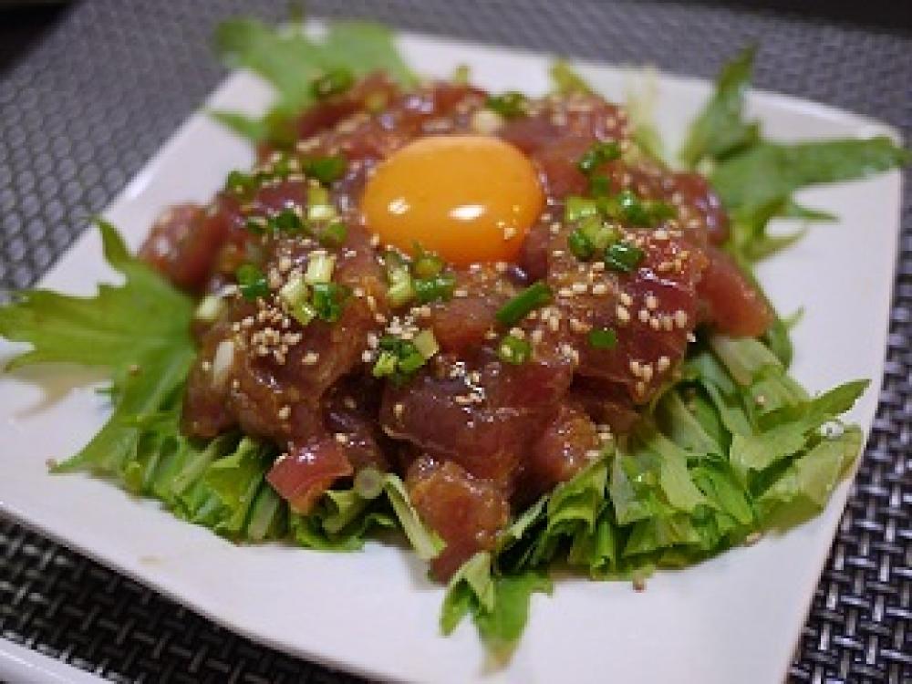 皿に1を盛り漬け、真ん中に卵黄をのせ万能ネギをちらしお好みで、白ごま、ごま油をかける。