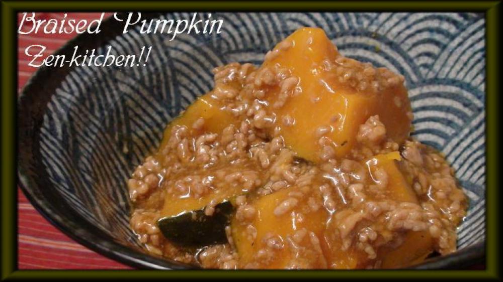 かぼちゃ、(調味料)を入れて、弱火で煮込み柔らかくなったら、水溶き片栗粉でトロみとつけて完成
