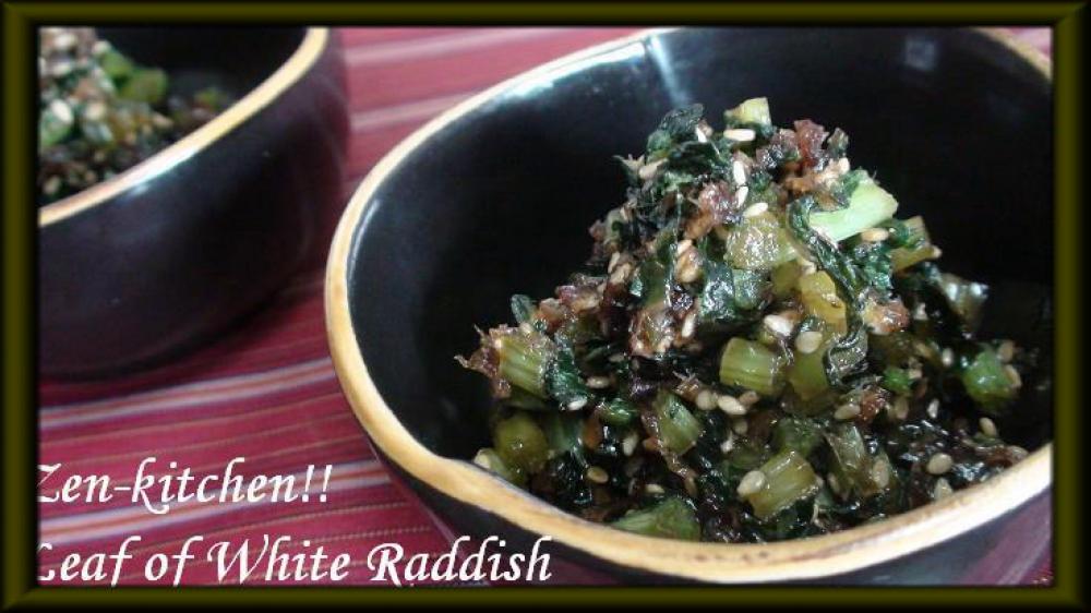 フライパンにごま油を入れ、大根の葉、かつお節を炒めて、(調味料)を入れて軽く炒めてできあがり