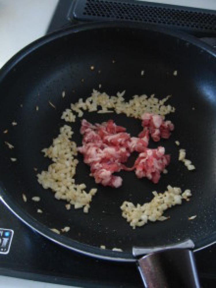 ![]() 下準備①:豚こまはたたいて粗挽きに、玉ねぎはみじん切り、インゲンは斜め切りにします。