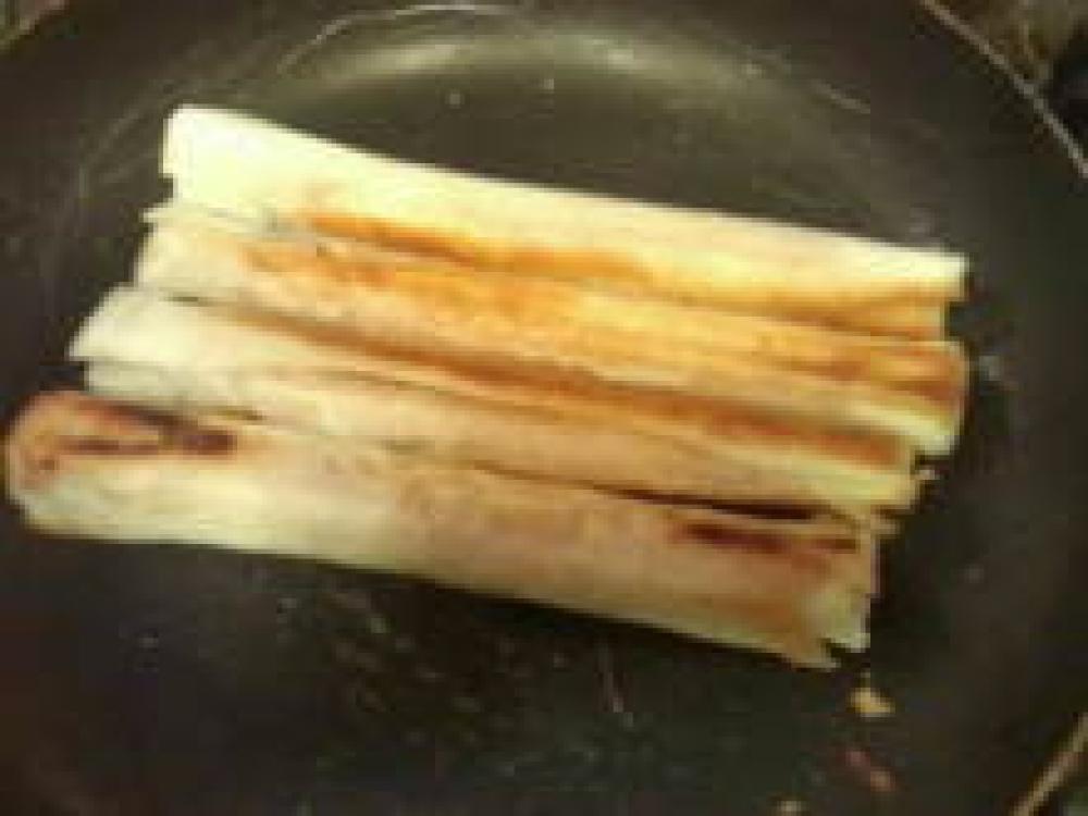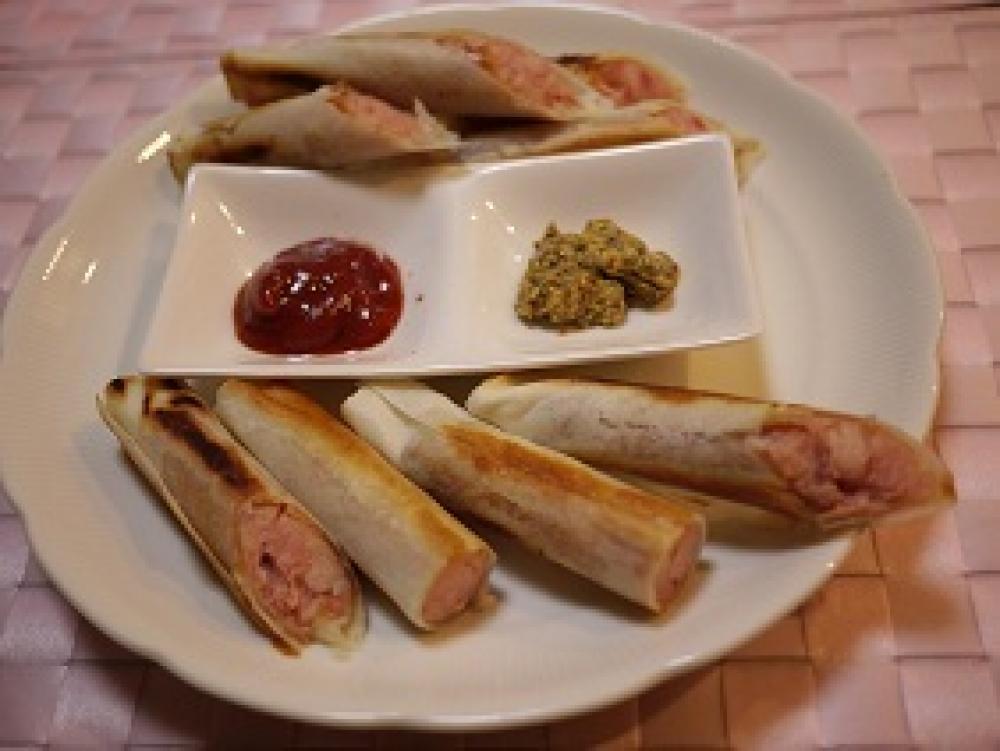 ![]() 春巻きの皮1枚で1のフランクを巻き、水溶き小麦粉をつけて熱したフライパンにサラダ油を入れ中火~弱火でこんがりと焼く。