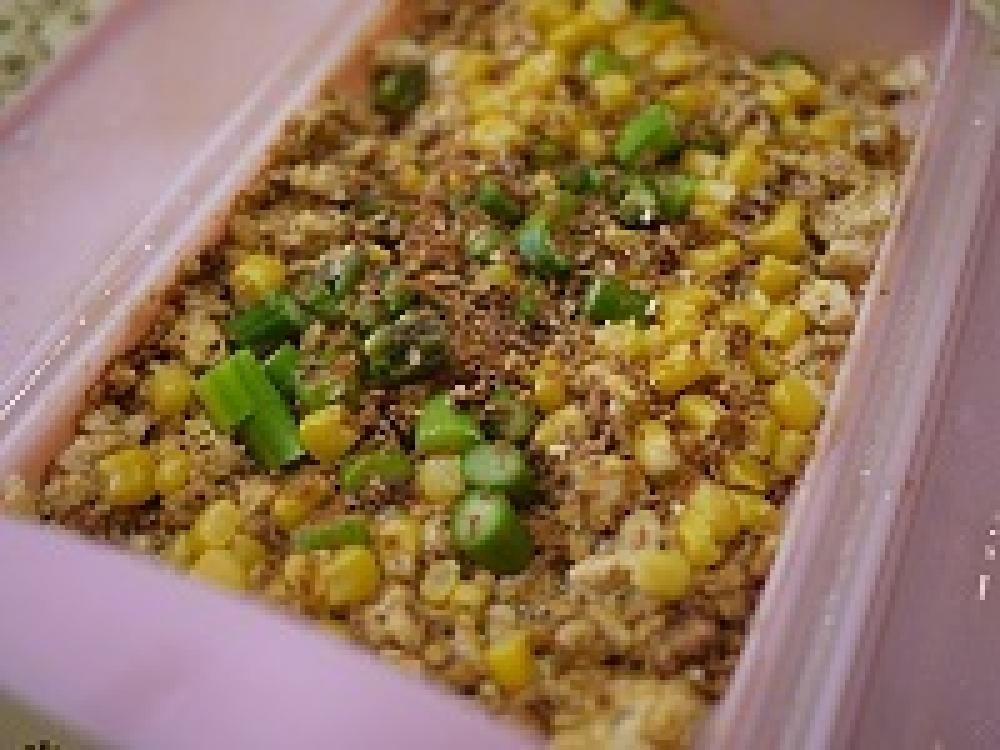 1が冷めたら手で崩し、コーン・小口切りにしたアスパラ、Aを入れ混ぜ合わせる。
