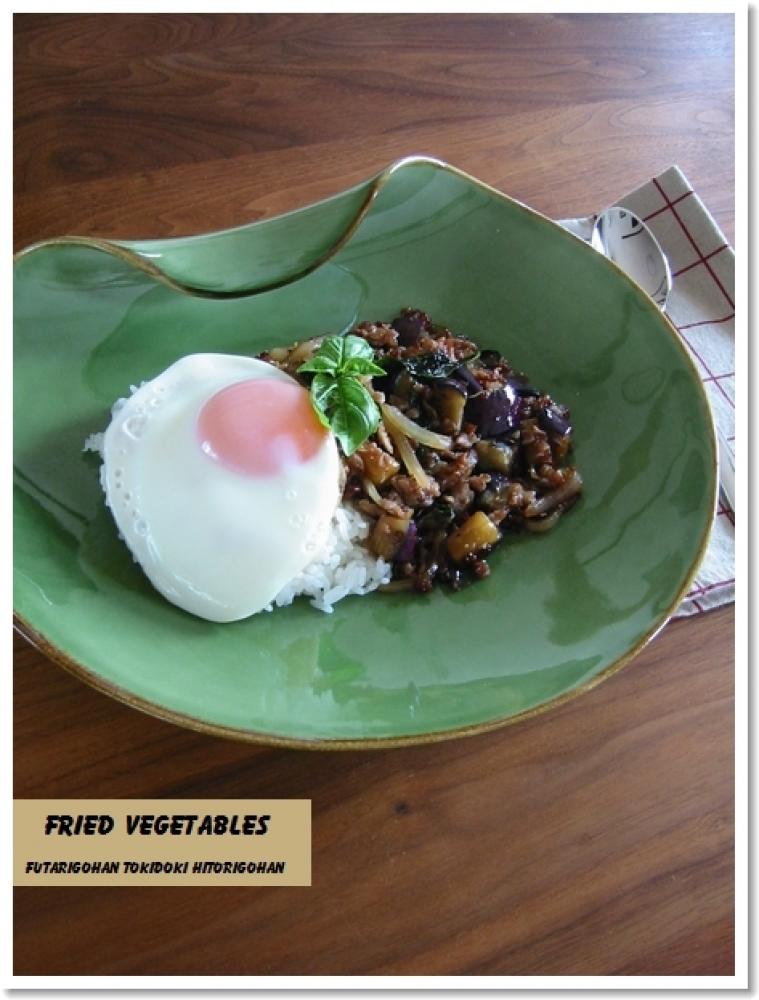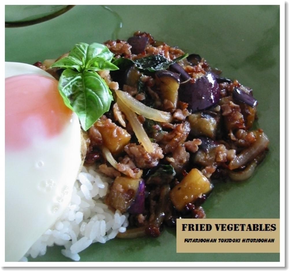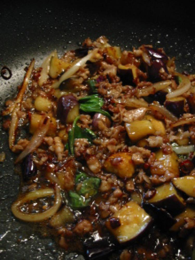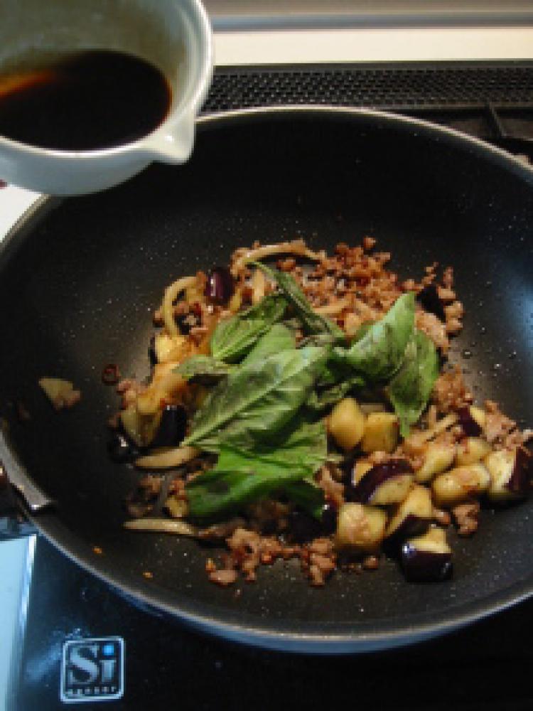 ![]() 次にナスも加えて柔らかくなるまで炒める。