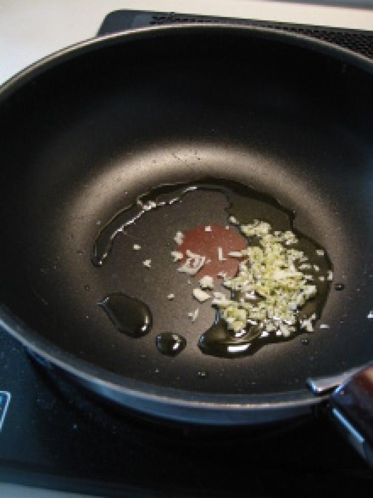 ![]() みじん切りしたにんにくをオリーブ油でゆっくり炒めます。
