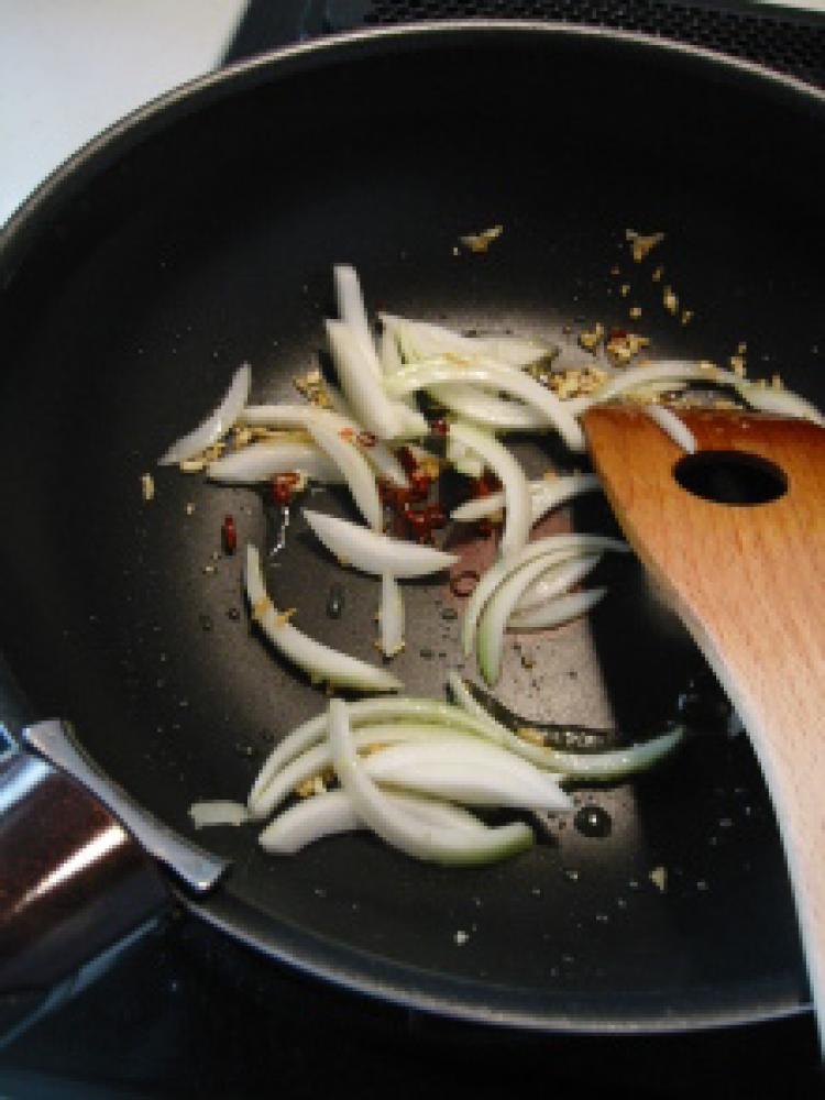 ![]() 玉ねぎとトウガラシを加えてさらに炒めましょう。